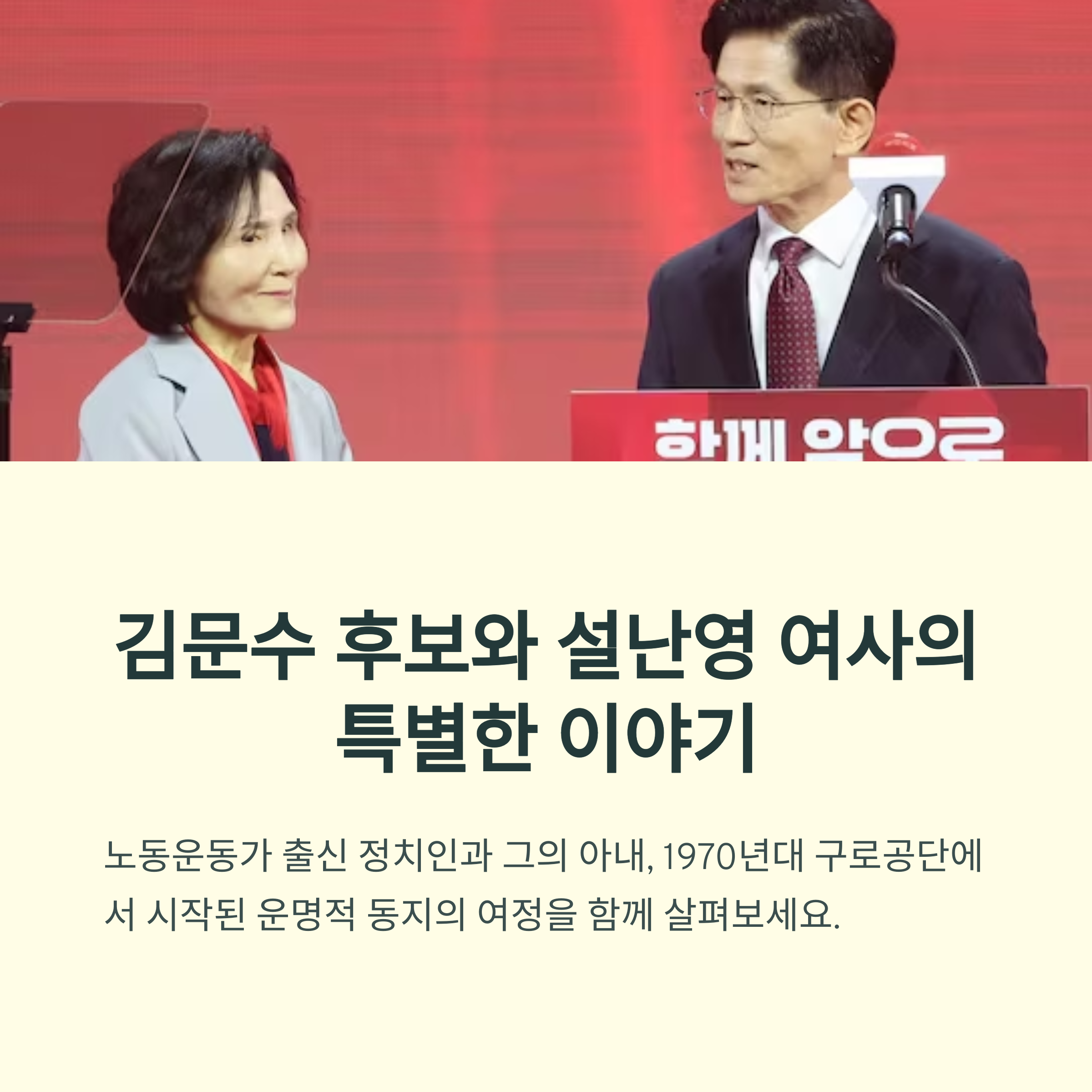 김문수 후보와 설난영 여사는 1970년대 말 구로공단에서 노동운동을 함께하며 인연을 맺었습니다. 당시 김 후보는 위장취업을 통해 노동운동을 펼쳤고, 설 여사는 세진전자에서 노조 활동을 하며 여성 노동자의 권익 향상에 힘썼습니다.
