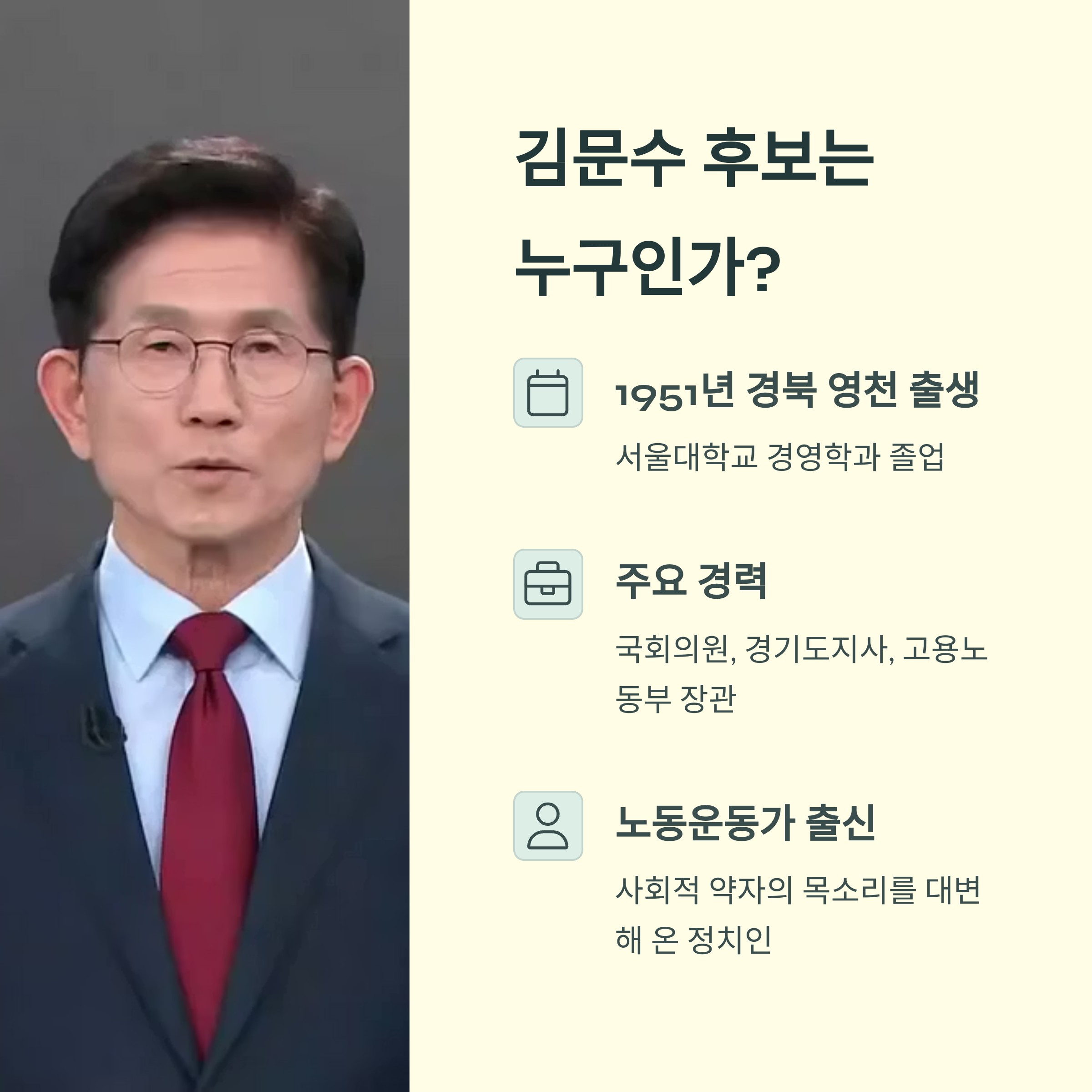 김문수 후보는 노동운동가 출신 정치인으로서, 사회적 약자의 목소리를 대변해 온 인물입니다. 경기도지사 재직 당시 복지와 경제개발을 조화롭게 추진했다는 평가를 받았으며, 고용노동부 장관 시절에는 노동시장 개혁과 청년 일자리 문제 해결에 주력했습니다.