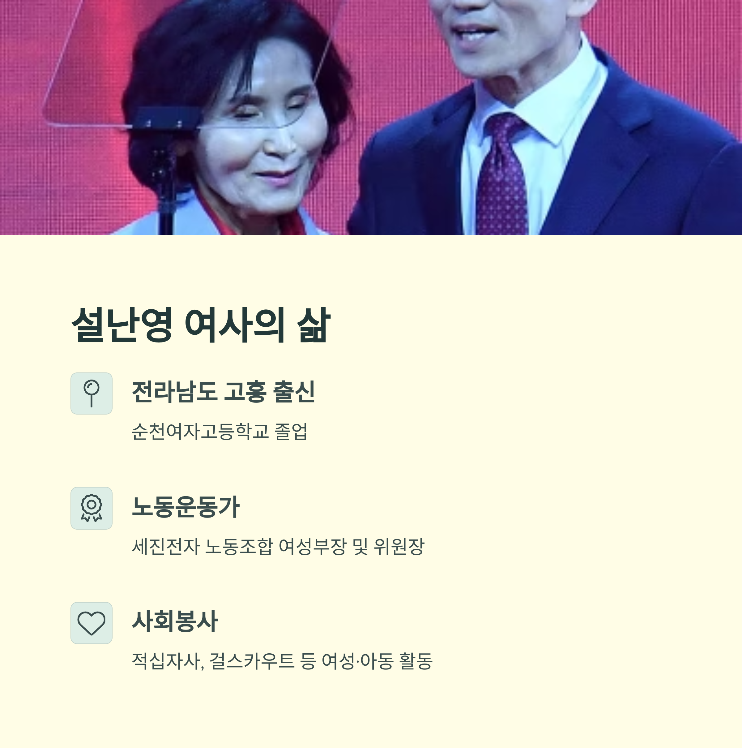 설난영 여사는 1970년대 구로공단에서 여성 노동자들의 권익 보호를 위한 노조 활동에 적극 참여했습니다. 이후에도 다양한 사회단체에서 여성과 아동을 위한 활동을 이어오며 따뜻한 리더십을 발휘해 왔습니다. 김문수 후보와의 결혼 또한 이런 신념의 연장선에서 진행되었으며, 두 사람은 “운명적 동지”로 알려져 있습니다.