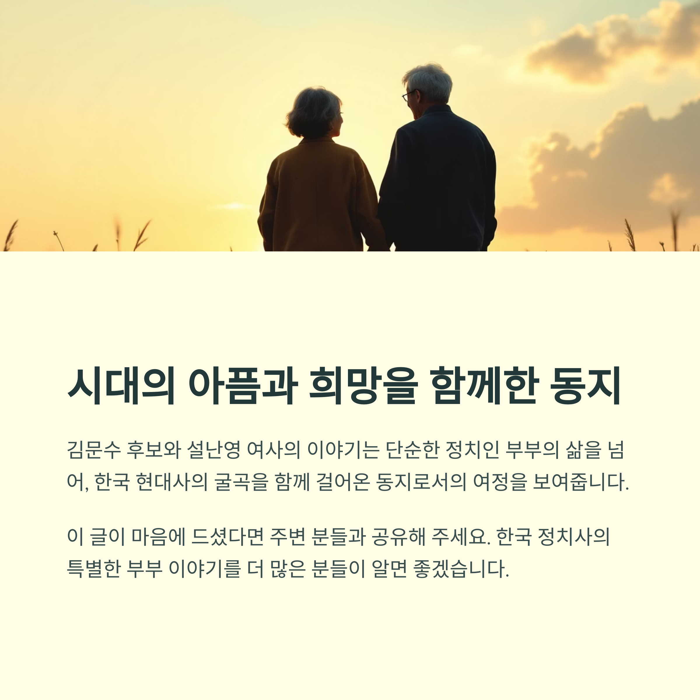 김문수 후보와 설난영 여사의 이야기는 단순한 정치인의 삶을 넘어, 시대의 아픔과 희망을 함께한 동지로서의 삶을 보여줍니다. 그들의 이야기는 많은 이들에게 감동과 영감을 주며, 앞으로의 행보에도 많은 관심이 쏠리고 있습니다.