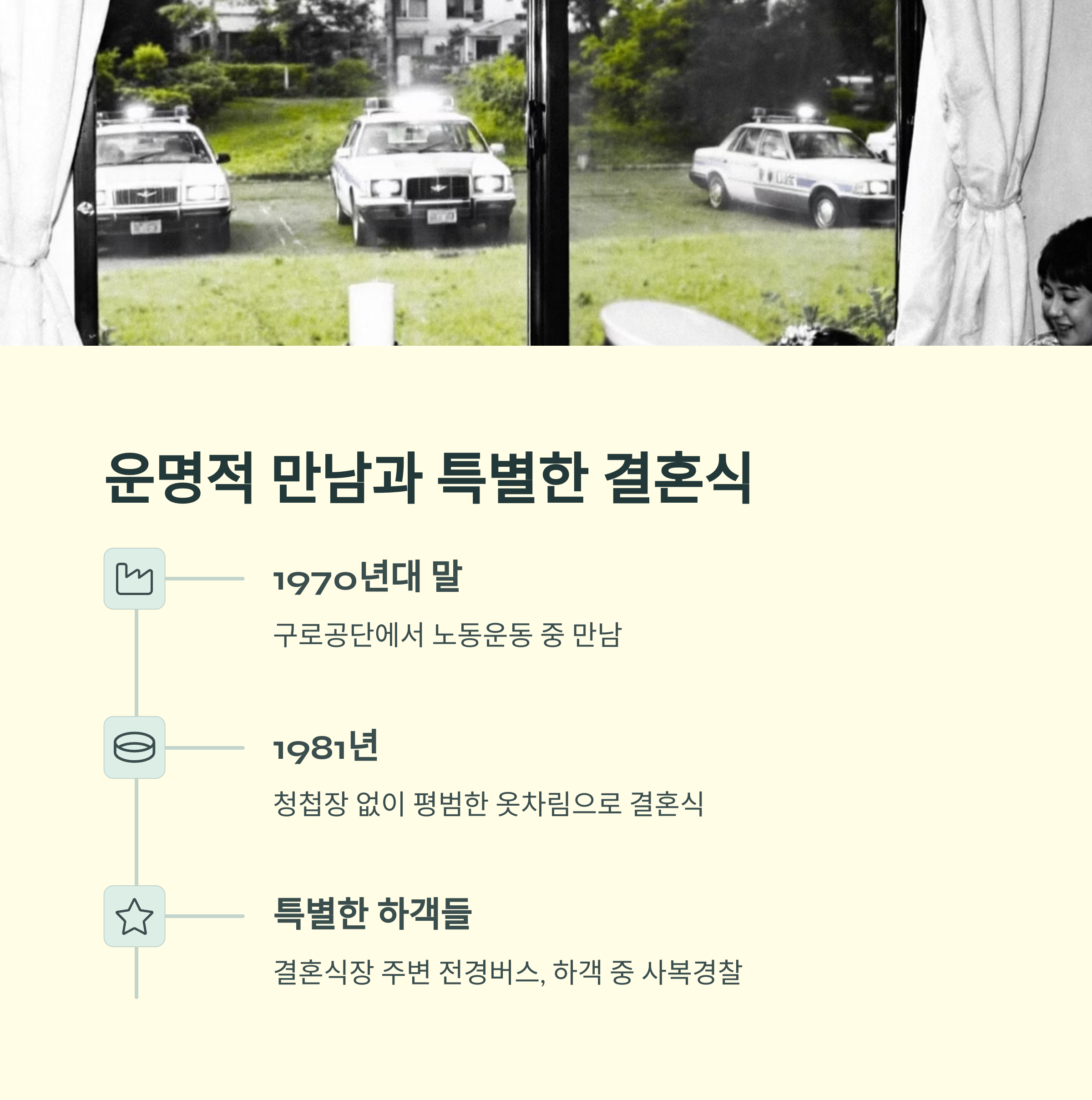 두 사람은 1981년, 특별한 결혼식을 올렸습니다. 당시 결혼식은 청첩장 없이 구두 약속으로 진행되었고, 신랑 신부는 웨딩드레스나 턱시도 대신 평소의 옷차림으로 참석했습니다. 결혼식장 주변에는 전경버스가 대기하고 있었으며, 하객 상당수는 사복경찰이었습니다. 이러한 결혼식은 두 사람의 신념과 당시 시대상을 반영하는 상징적인 사건으로 평가받고 있습니다.