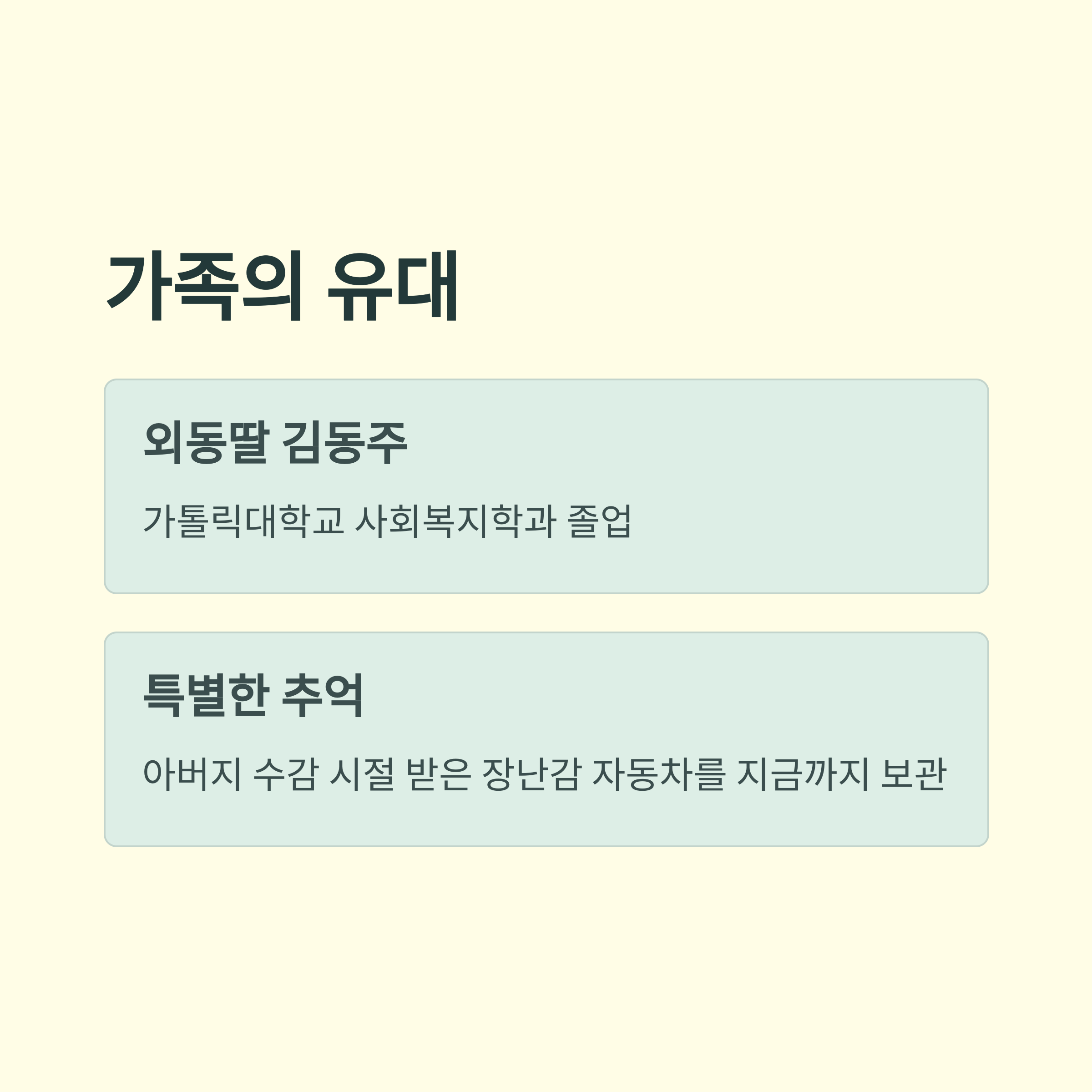 김문수 후보와 설난영 여사는 외동딸 김동주 씨를 두고 있습니다. 김 씨는 가톨릭대학교 사회복지학과를 졸업했으며, 어린 시절 아버지가 교도소에 수감되어 있을 때 받은 장난감 자동차를 지금까지 간직하고 있을 정도로 가족 간의 유대가 깊습니다.