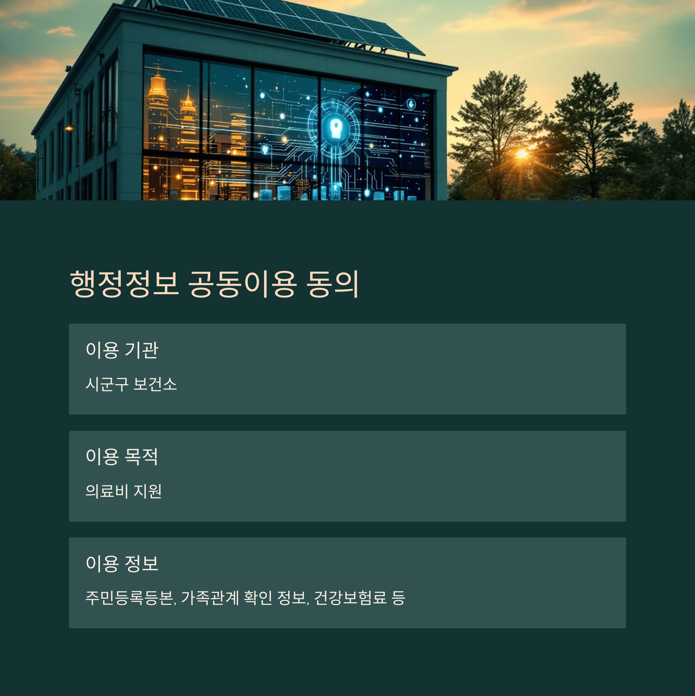 의료비 지원 업무의 효율성을 위해 행정정보 공동이용 동의가 요구됩니다.