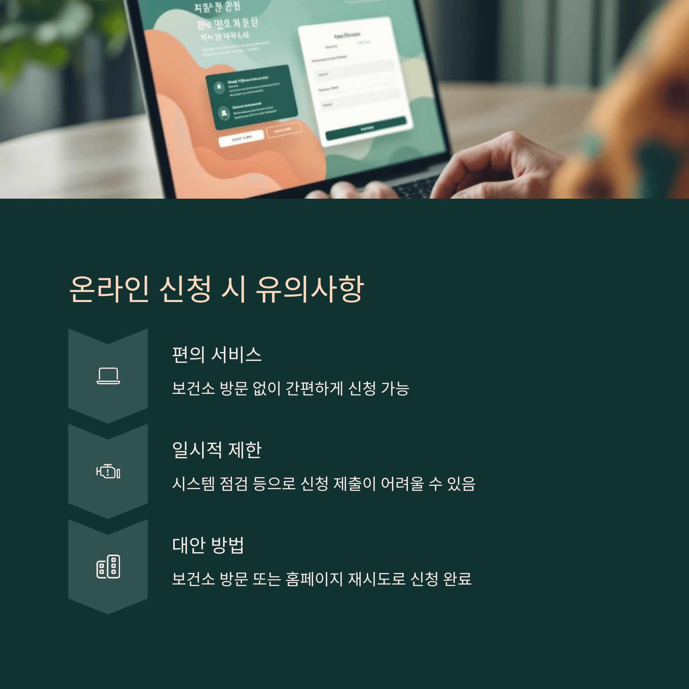 온라인 신청 서비스는 보건소 방문 없이 간편하게 신청할 수 있도록 마련된 편의 서비스입니다. 하지만 다음과 같은 점에 유의하세요: