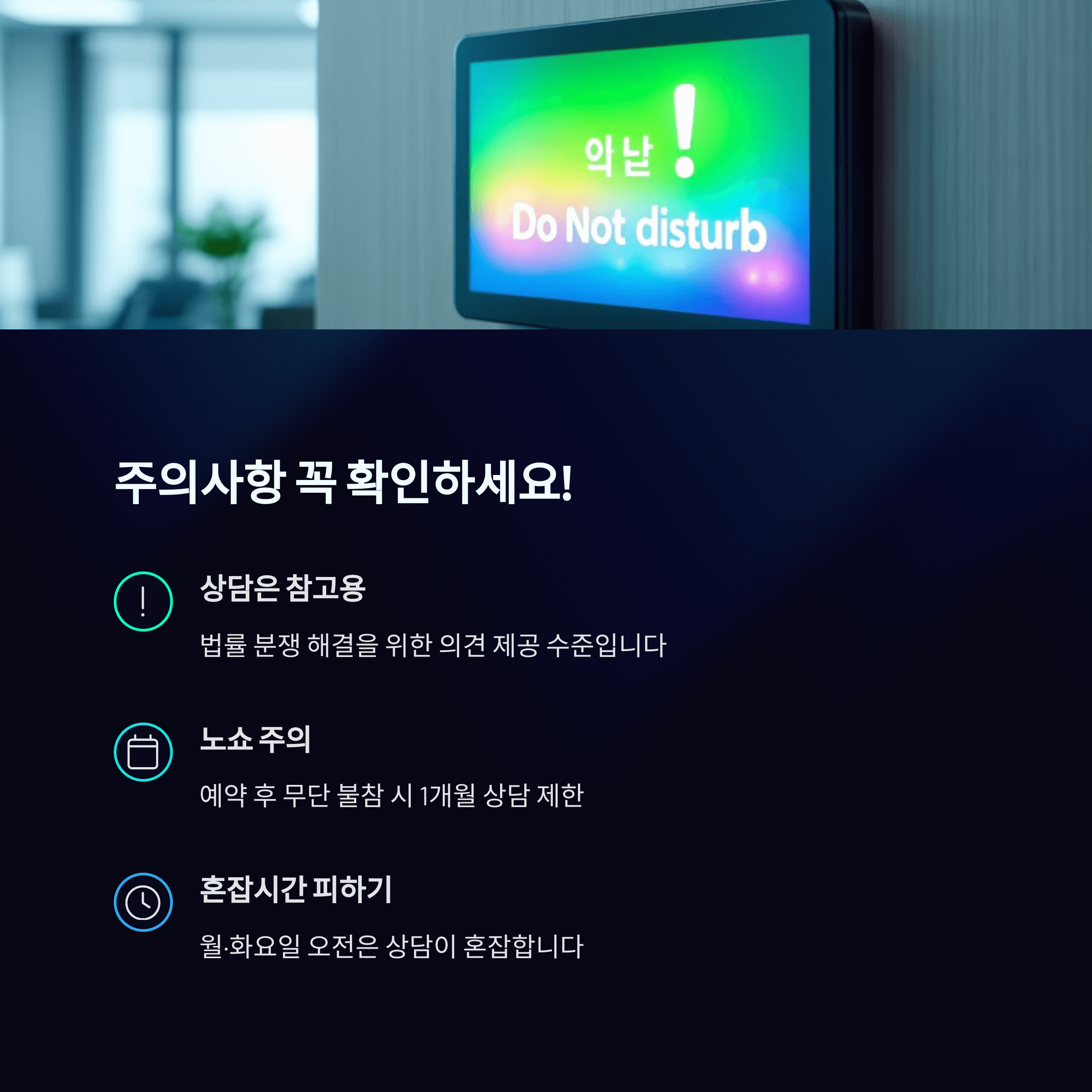 한정된 인력으로 운영되기 때문에 ‘노쇼’(예약 후 무단 불참)는 1개월 상담 제한이 있습니다.