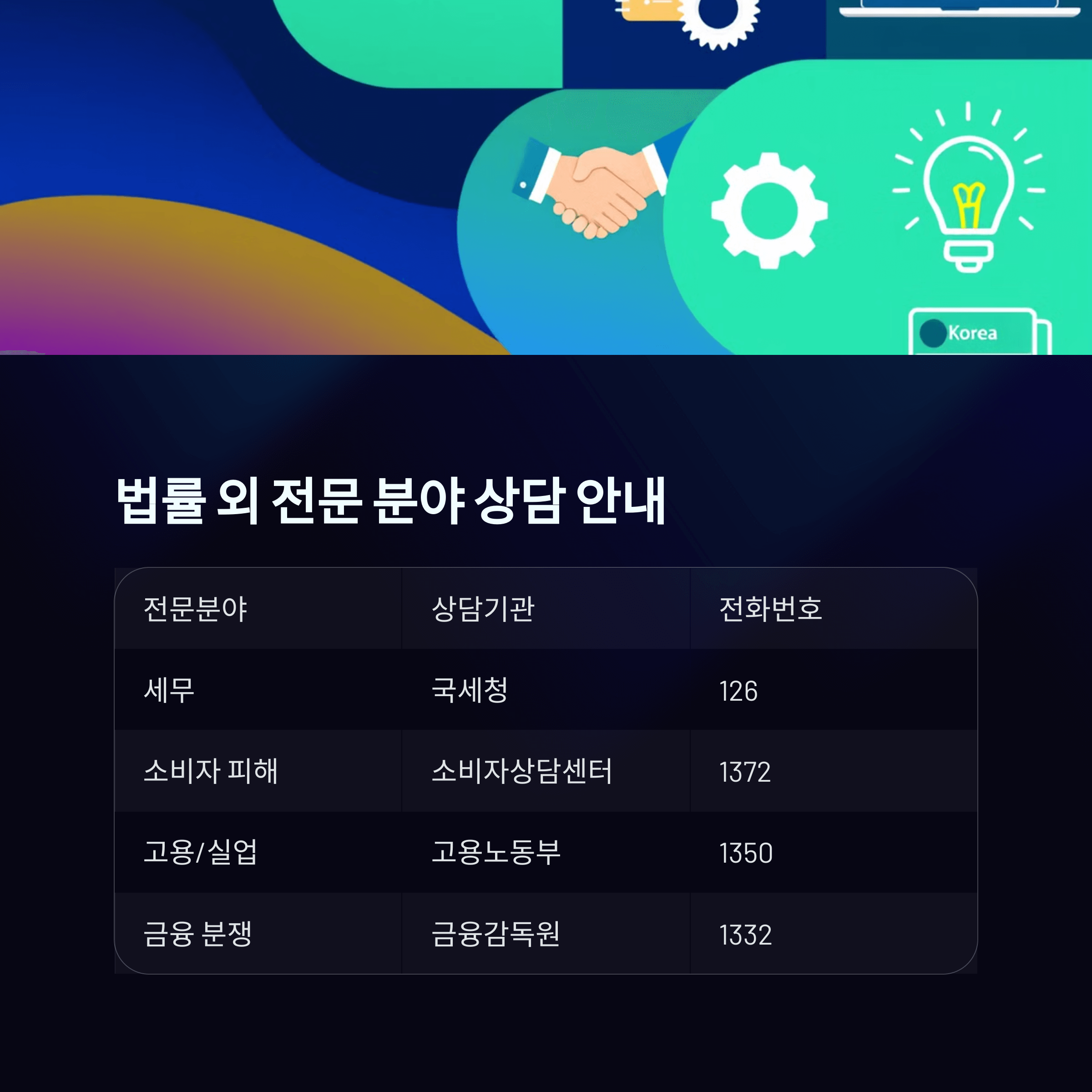 세무, 소비자 피해, 금융 분쟁 등은 관련 기관을 안내받아 보다 정확한 상담이 가능합니다.