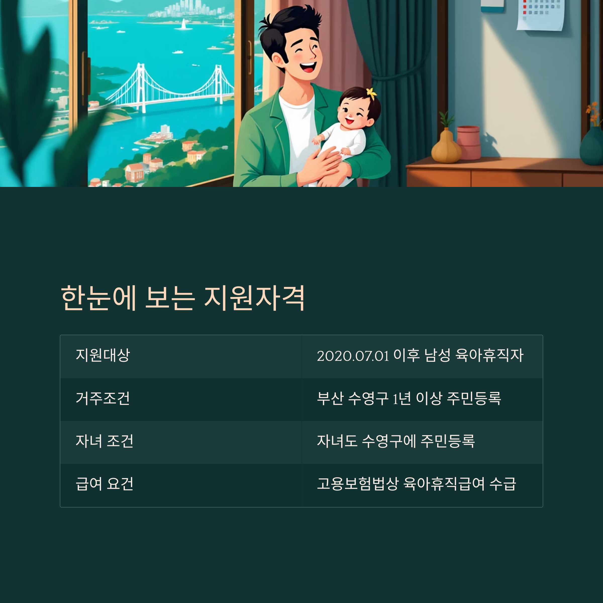 부산 수영구는 남성의 육아참여 확대를 위해 '아빠 육아휴직 장려금 지원사업'을 시행 중입니다.