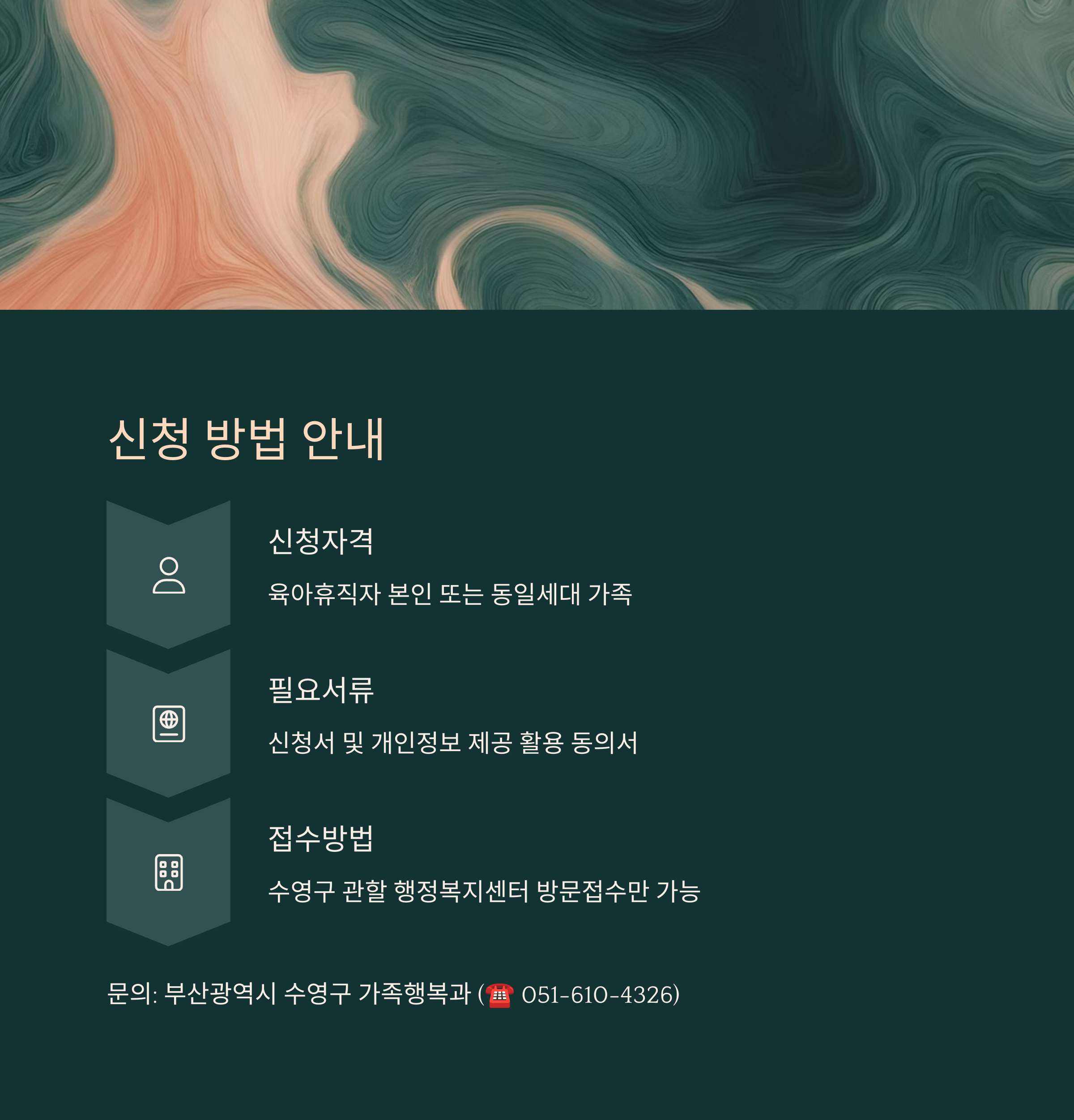 접수 및 문의는 부산광역시 수영구 가족행복과 (☎ 051-610-4326)로 연락하세요.