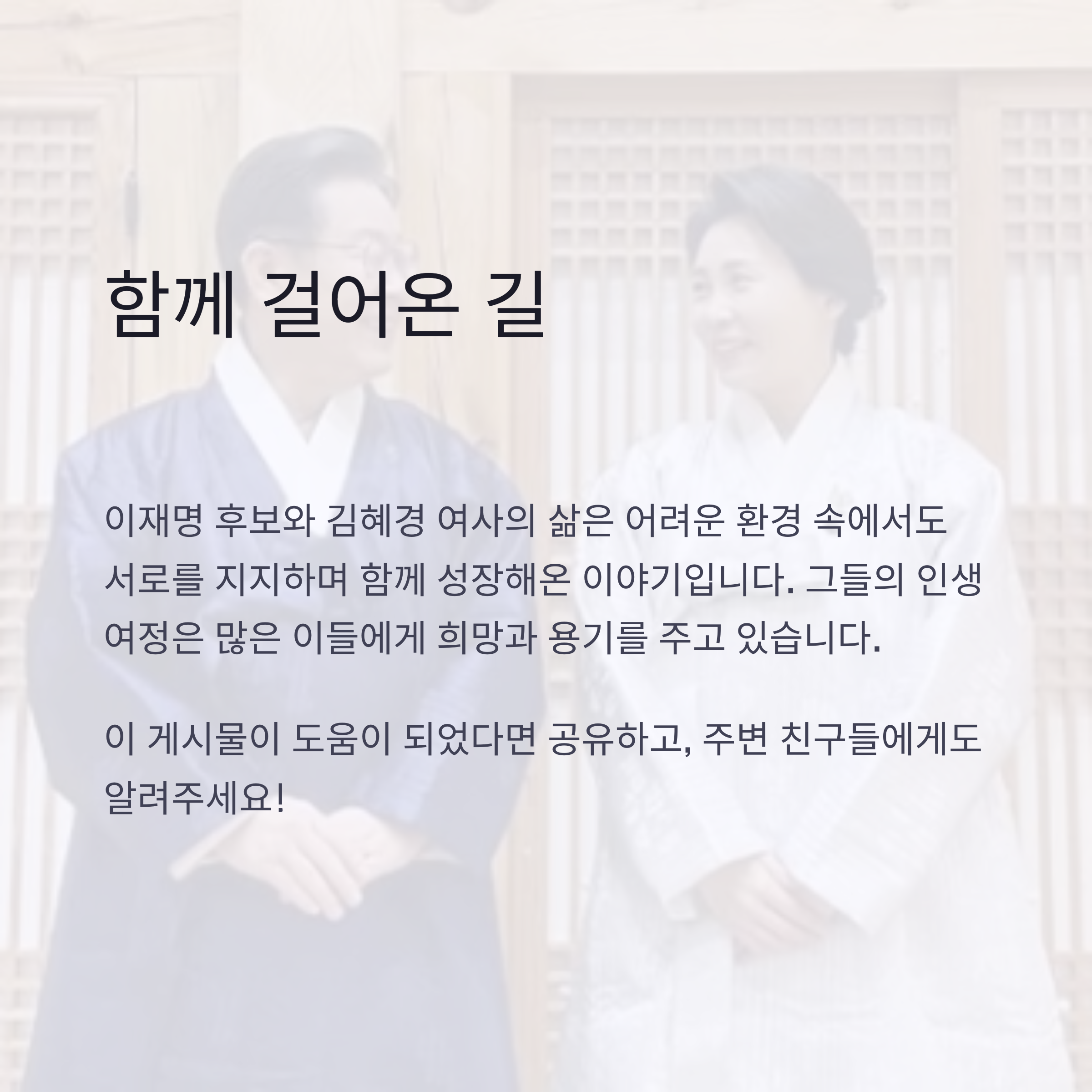 이재명 후보와 김혜경 여사의 삶은 어려운 환경 속에서도 서로를 지지하며 함께 성장해온 이야기입니다. 그들의 인생 여정은 많은 이들에게 희망과 용기를 주며, 앞으로의 행보에도 많은 관심이 쏠리고 있습니다.