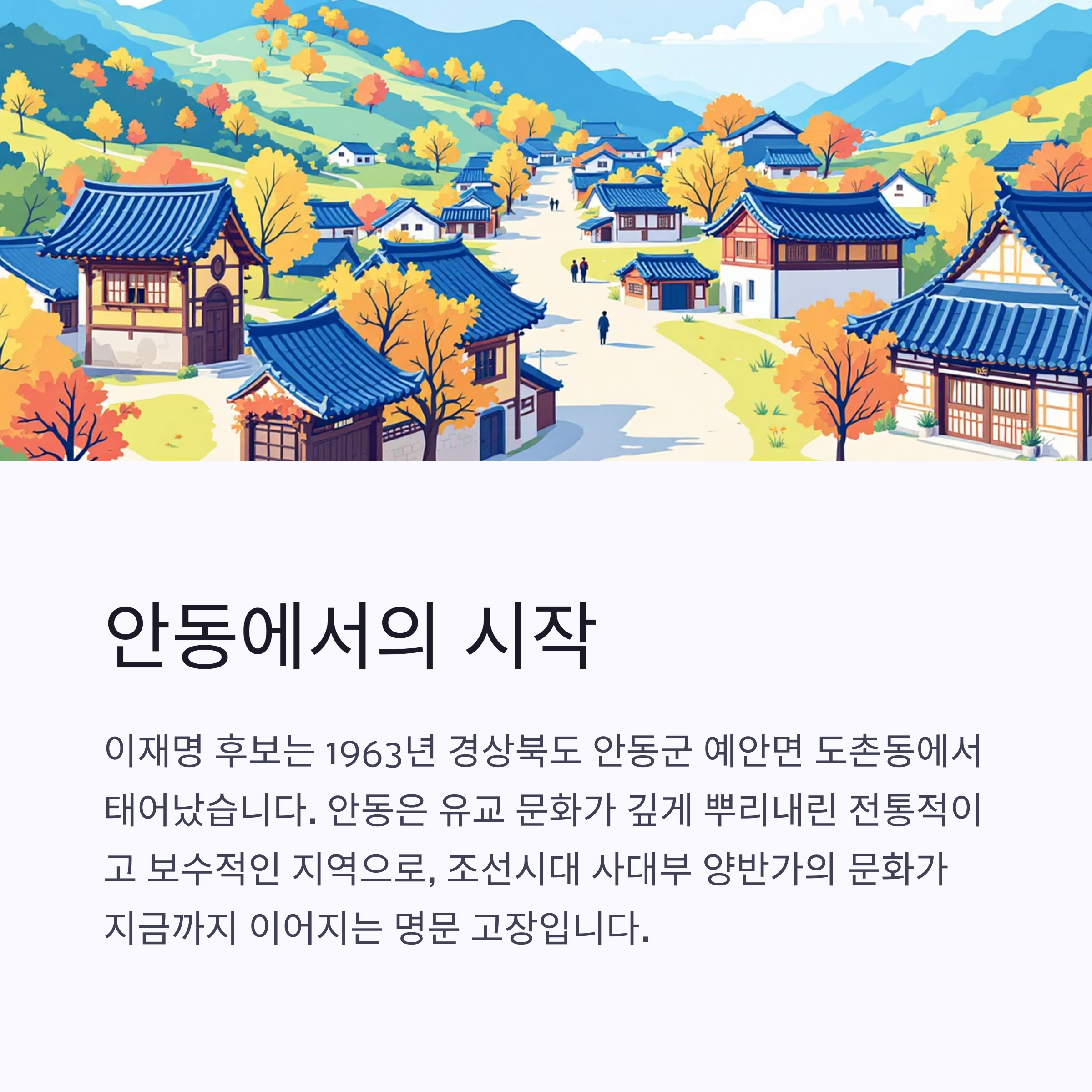 이재명 후보는 1963년 12월 8일, 경상북도 안동군 예안면 도촌동에서 태어났습니다. 그의 고향 안동은 예로부터 유교 문화가 깊게 뿌리내린 지역으로, 전국적으로도 전통과 보수적인 성향이 강한 곳으로 알려져 있습니다. 조선시대 사대부 양반가의 문화가 지금까지도 전해 내려오는 지역으로, 많은 역사적 인물과 학자들이 배출된 명문 고장이기도 합니다.