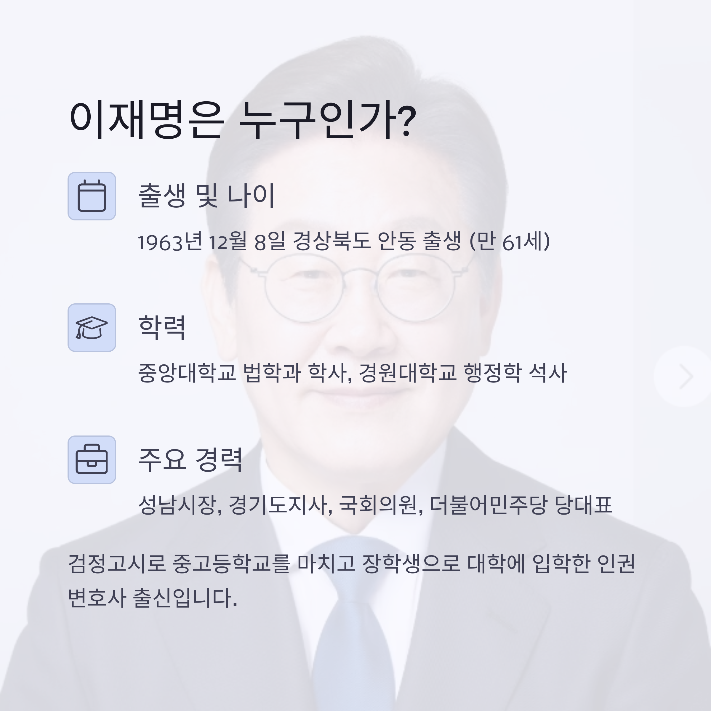 이재명 더불어민주당 제21대 대통령 선거 후보는 노동자 출신 인권변호사로서, 성남시장과 경기도지사를 역임하며 정치적 입지를 다져왔습니다. 그의 부인 김혜경 여사와의 인연, 그리고 고향 안동에서의 성장 배경은 그의 정치 철학과 삶의 방향에 큰 영향을 미쳤습니다.