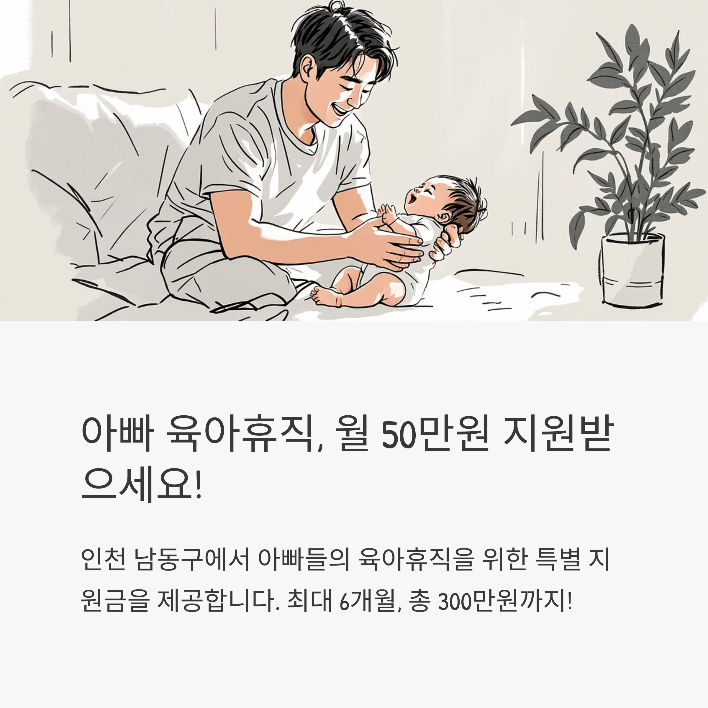 남성 육아휴직, 아직 선택 아닌가요?연수구는 ‘아빠 육아휴직 장려금’으로 월 50만원씩 최대 6개월 지원합니다.지금이 바로, 가족과 함께할 기회를 잡을 때입니다! 최대 300만원 지원금 신청하