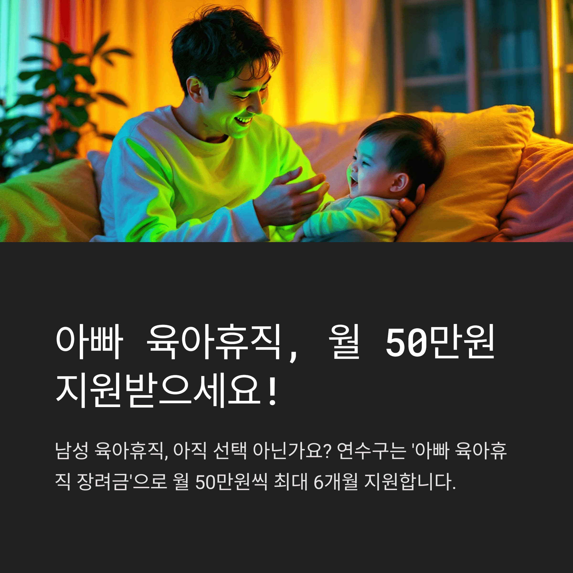 연수구는 ‘아빠 육아휴직 장려금’으로 월 50만원씩 최대 6개월 지원합니다.