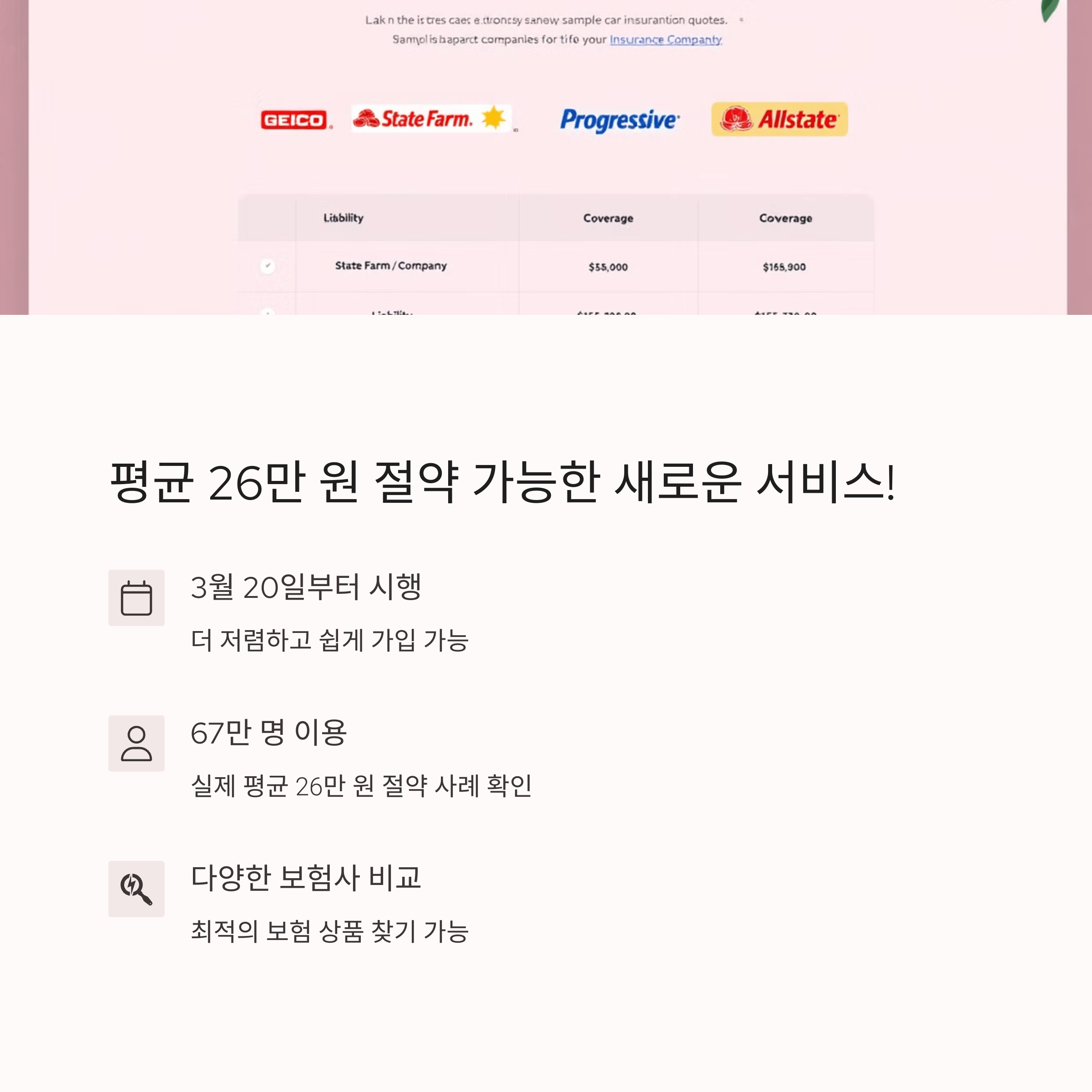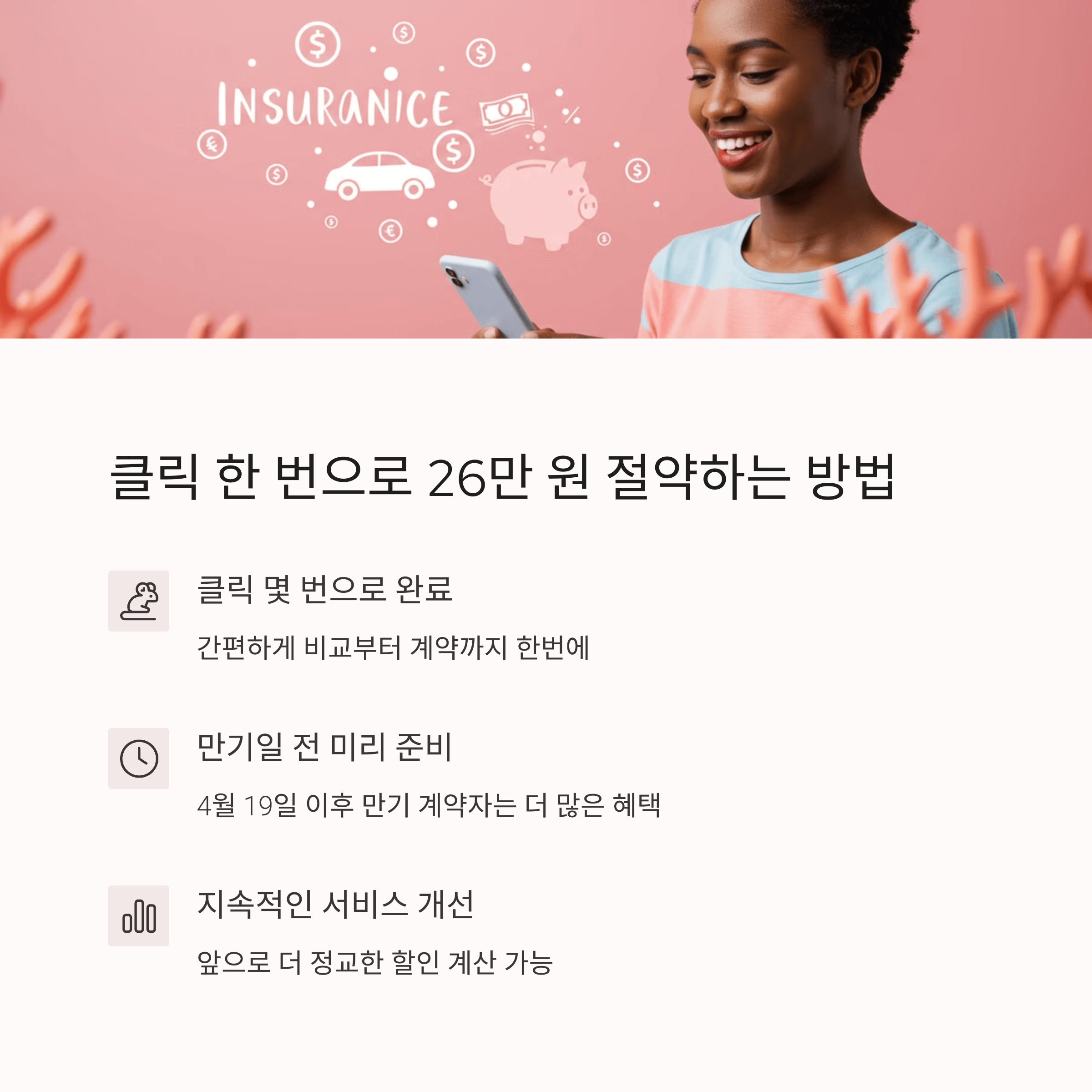 67만 명이 이 서비스를 활용하여 평균 26만 원을 절약했습니다. 클릭 몇 번이면 더 저렴한 보험료를 확인하고 계약까지 완료할 수 있는 구조입니다.