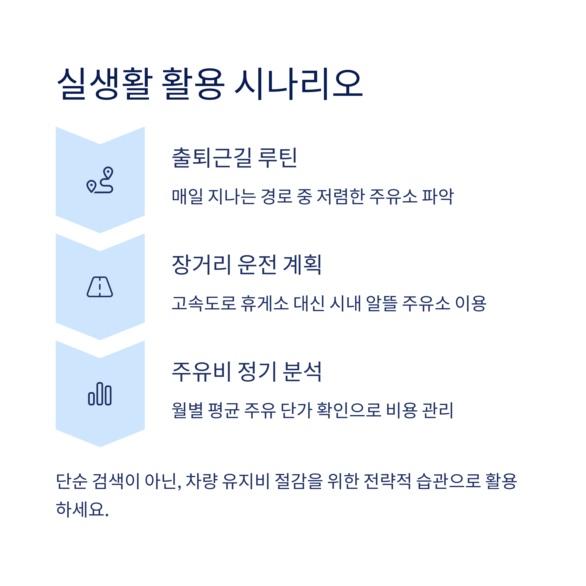 - 출퇴근길 루틴: 매일 지나는 경로 중 가격이 낮은 주유소를 파악해 두면 연료비 절감 효과 상승
