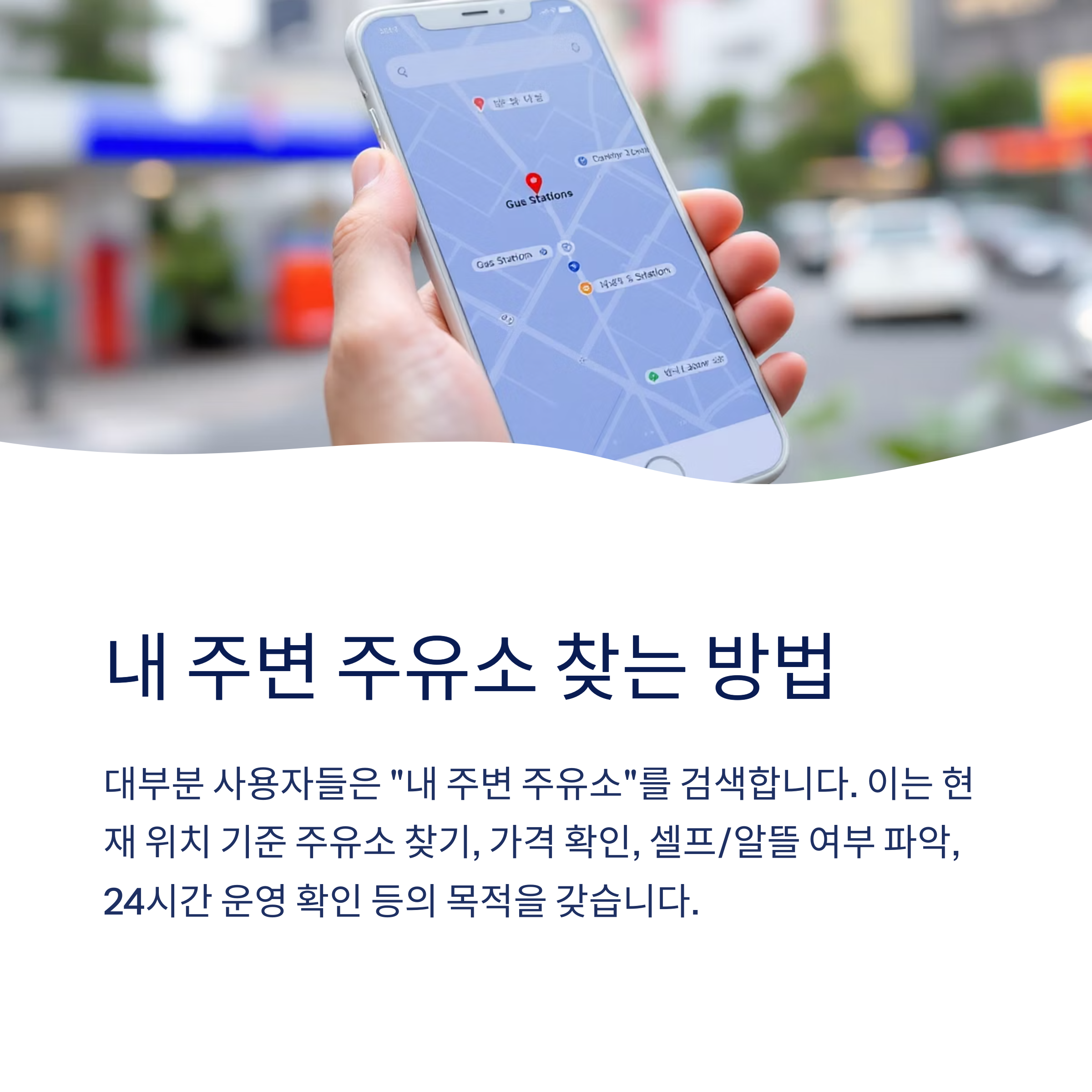 대부분의 사용자들은 급하게 기름이 떨어졌을 때, 가장 먼저 네이버나 구글에 "내 주변 주유소"를 검색합니다. 이는 검색 의도가 매우 명확한 키워드로, 주로 현재 위치 기준 주유소 찾기, 저렴한 가격 확인, 셀프/알뜰 여부 파악, 24시간 운영 확인 등의 목적을 갖습니다.