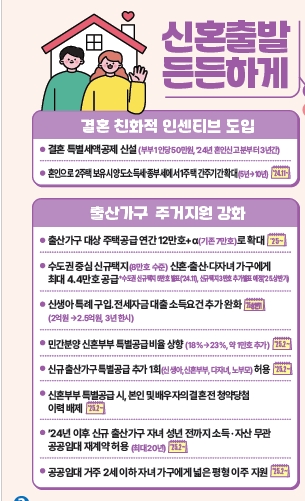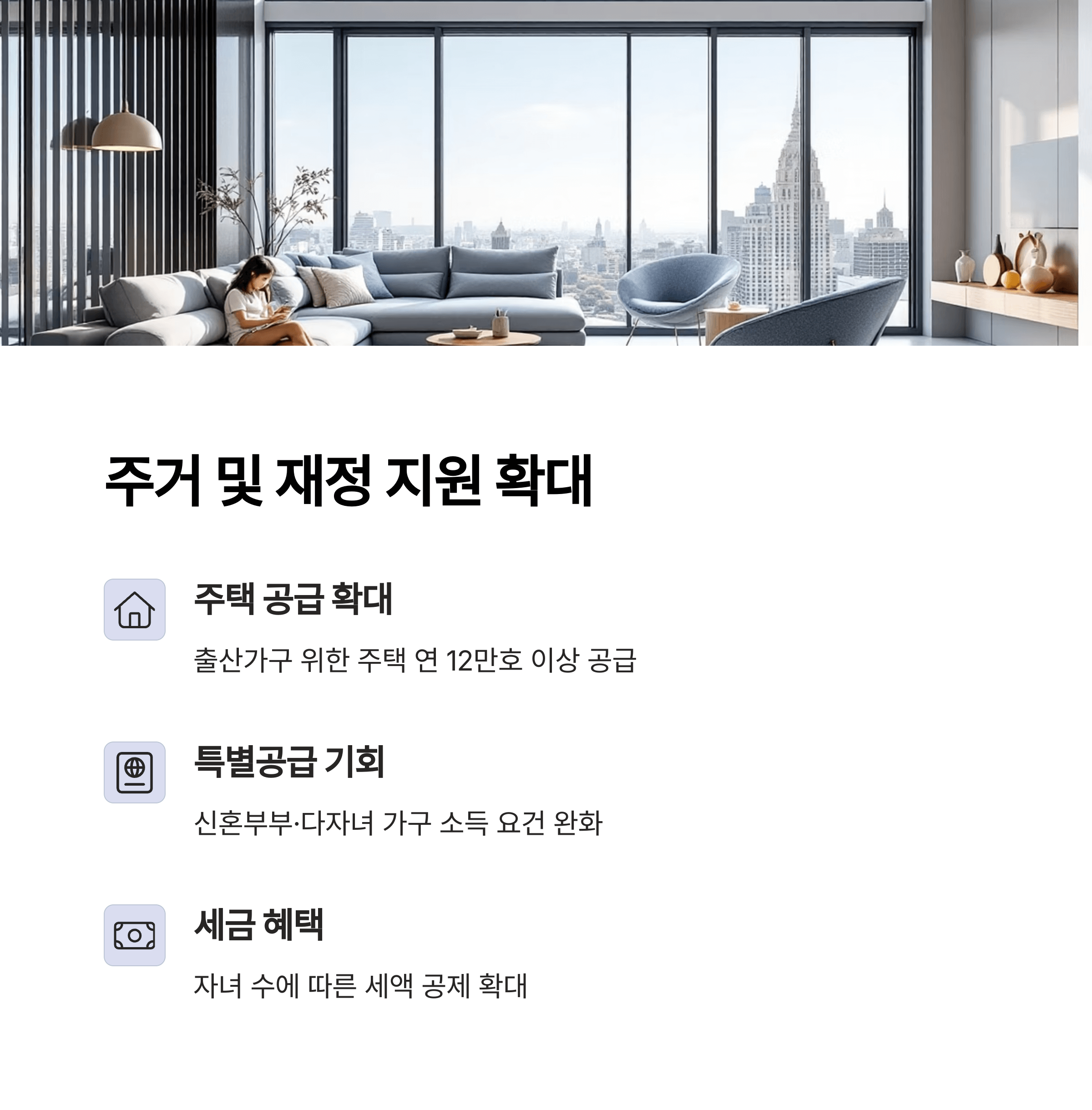 A. 출산가구 대상 공공 및 민간 주택 특별 공급이 늘어나며, 소득 요건도 완화됩니다. 또한 넓은 평형으로의 이주도 지원됩니다.