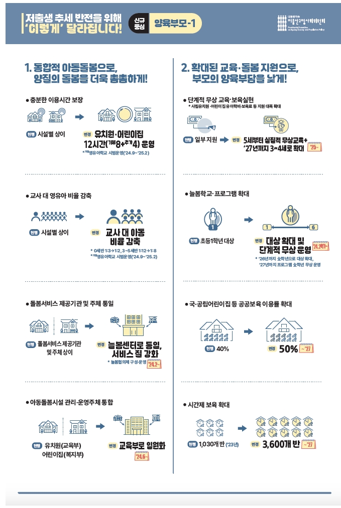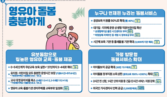 0~5세 유보통합으로 질 높은 보육이 실현되며, 아이돌봄 서비스 소득기준이 완화됩니다.