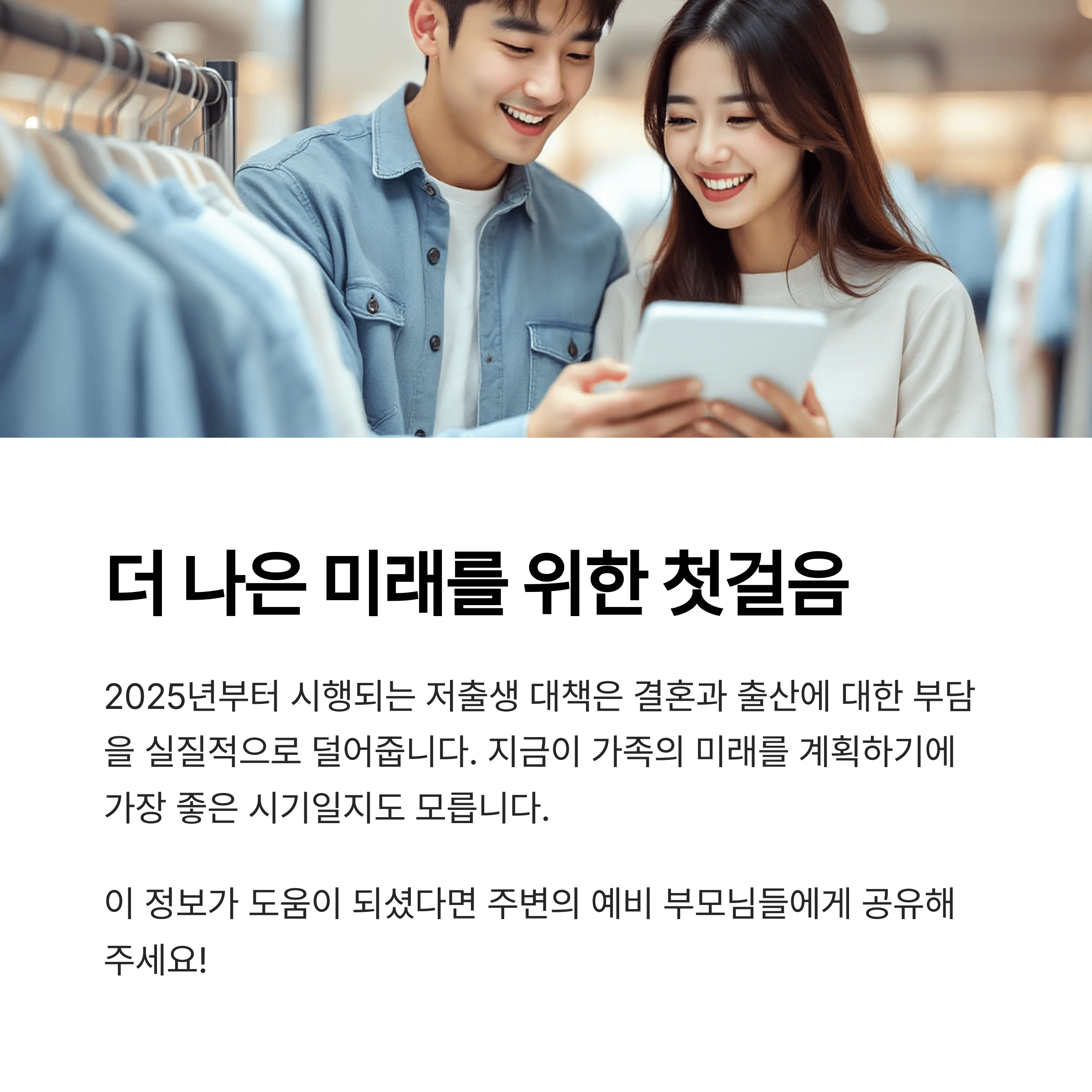 2025년부터 시행되는 저출생 대책은 실질적인 변화로 이어지고 있습니다. 정부는 더 촘촘하고, 현실적인 정책을 통해 출산과 육아의 부담을 덜어주고자 합니다. 결혼과 출산을 고민 중이라면 지금이 가장 좋은 시기일지도 모릅니다. 관련 제도를 잘 활용해보세요!