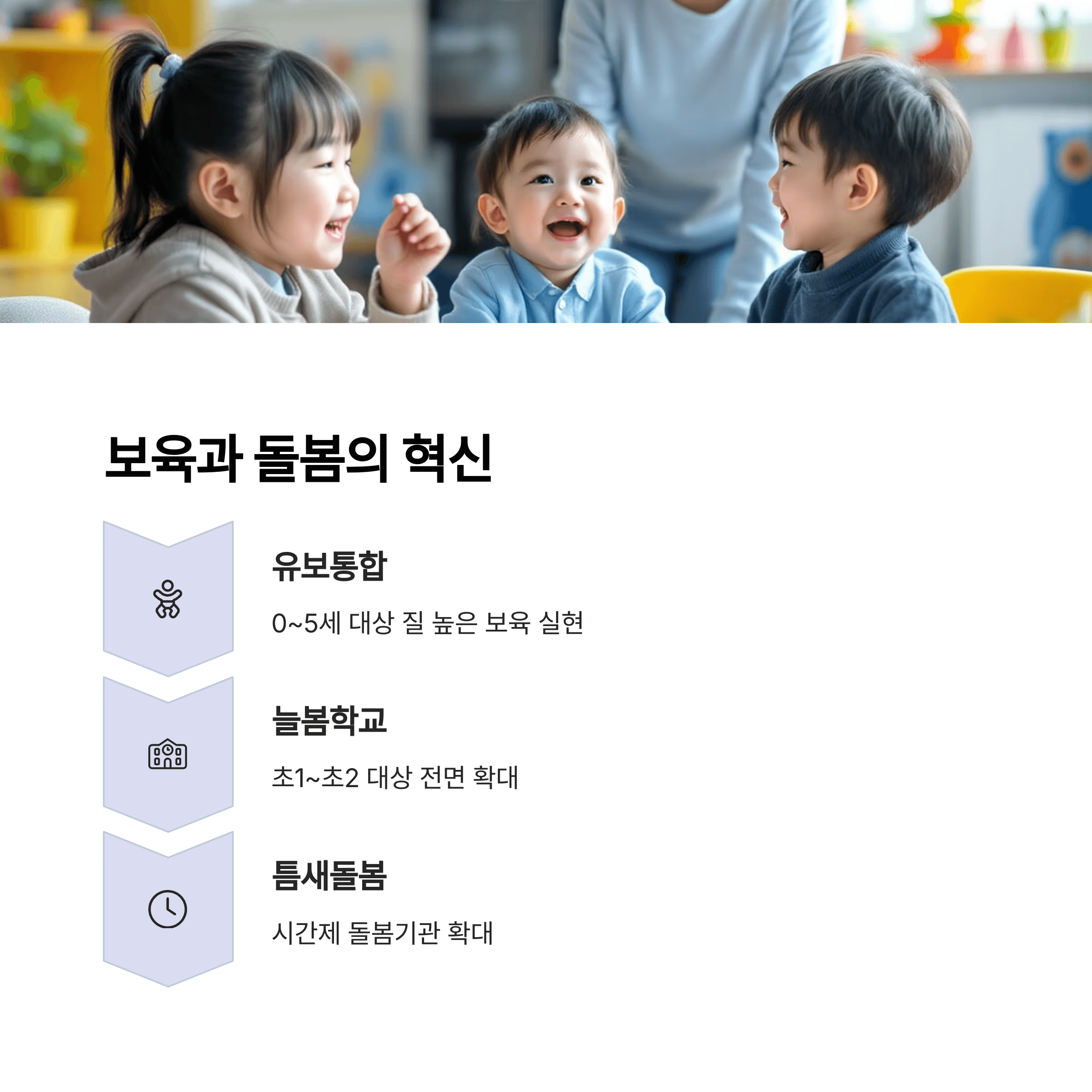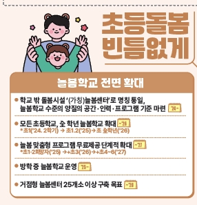 늘봄학교는 2025년 초1~초2 대상까지 전면 확대되며, 틈새돌봄 및 시간제 돌봄기관도 확대됩니다.