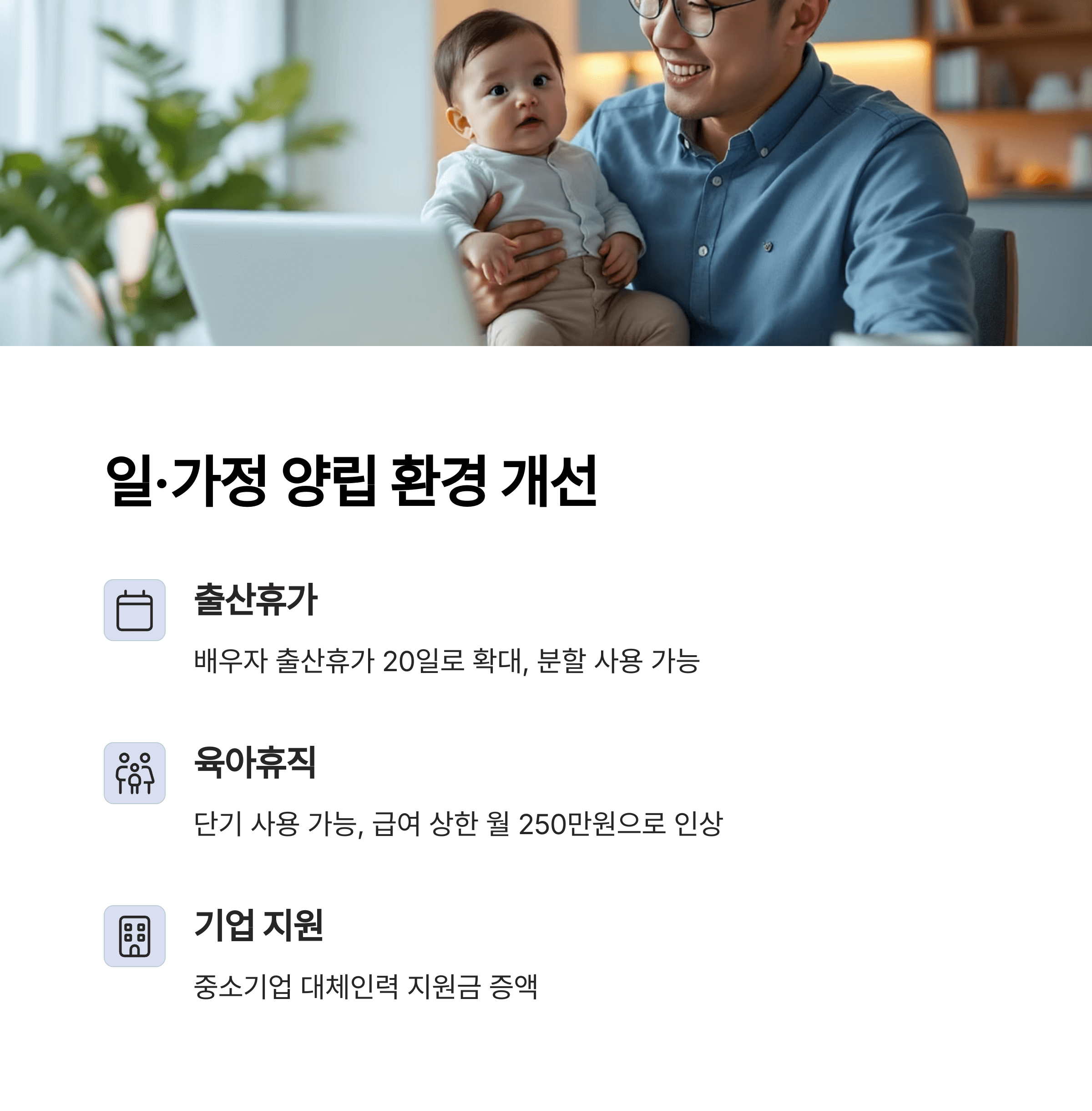 중소기업에는 배우자 출산휴가 급여 지원이 확대되고, 대체인력 지원금도 증액됩니다.