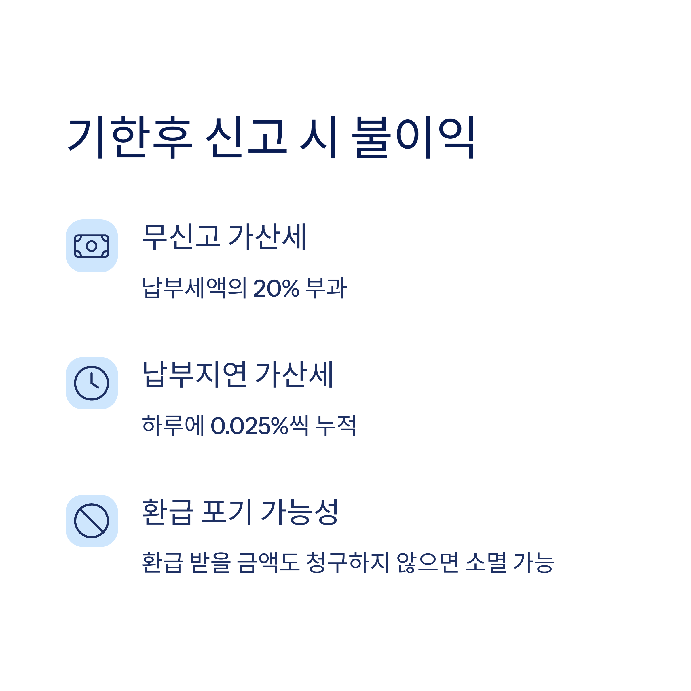 기한후 신고라고 해도 무조건 용서받는 건 아닙니다. 다음과 같은 불이익이 있을 수 있어요