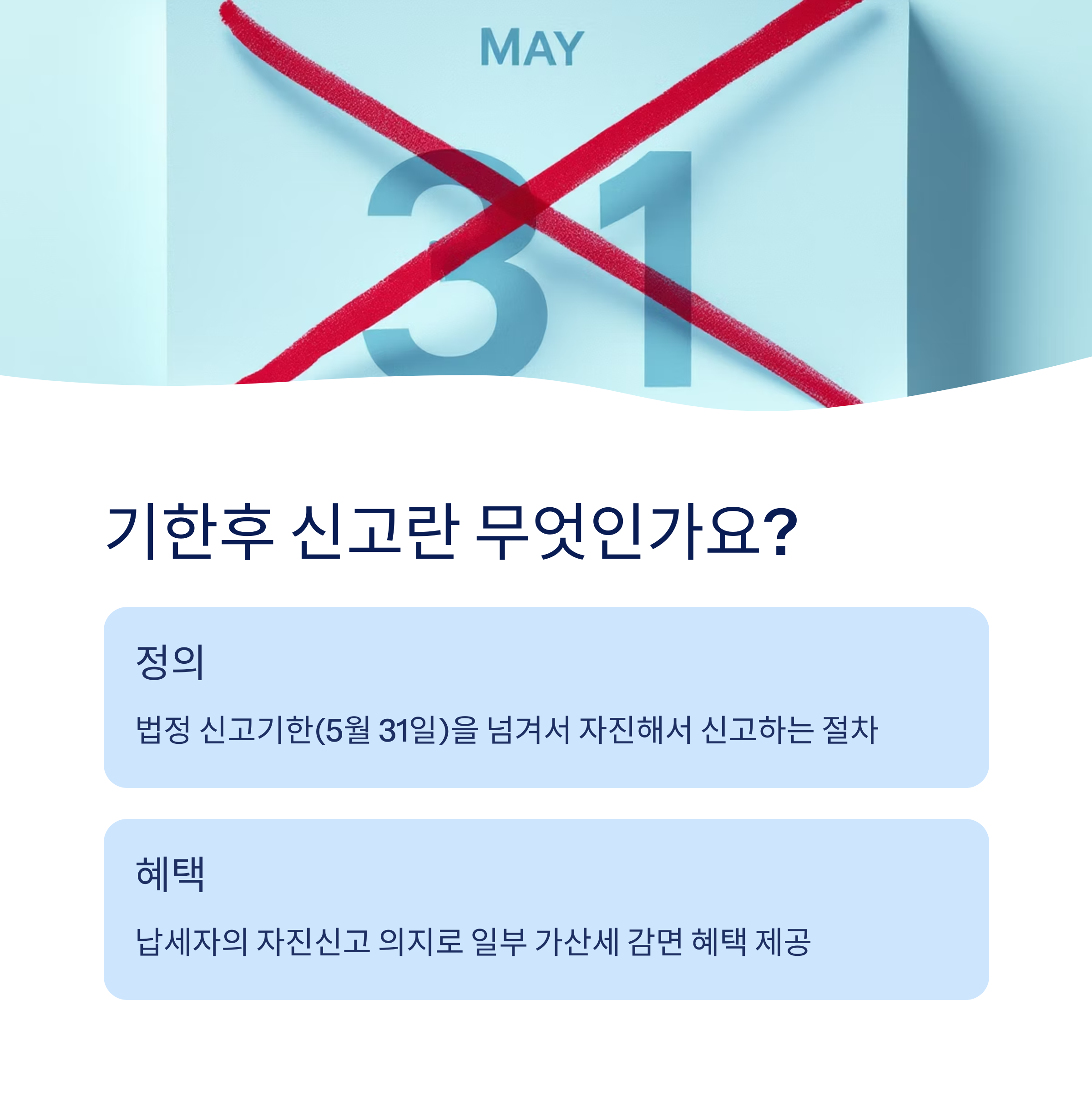 기한후 신고란 말 그대로 정해진 법정 신고기한(예: 5월 31일)을 넘겨서 자진해서 신고하는 절차입니다. 이는 납세자의 자진신고 의지가 있기 때문에, 세무서에서도 일부 가산세 감면 혜택을 제공하고 있습니다.