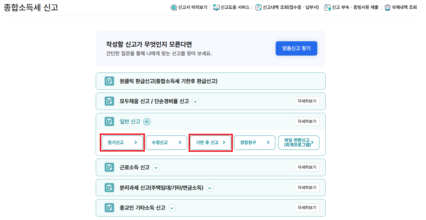 - '종합소득세' → 정기신고(또는 기한후 신고) 선택