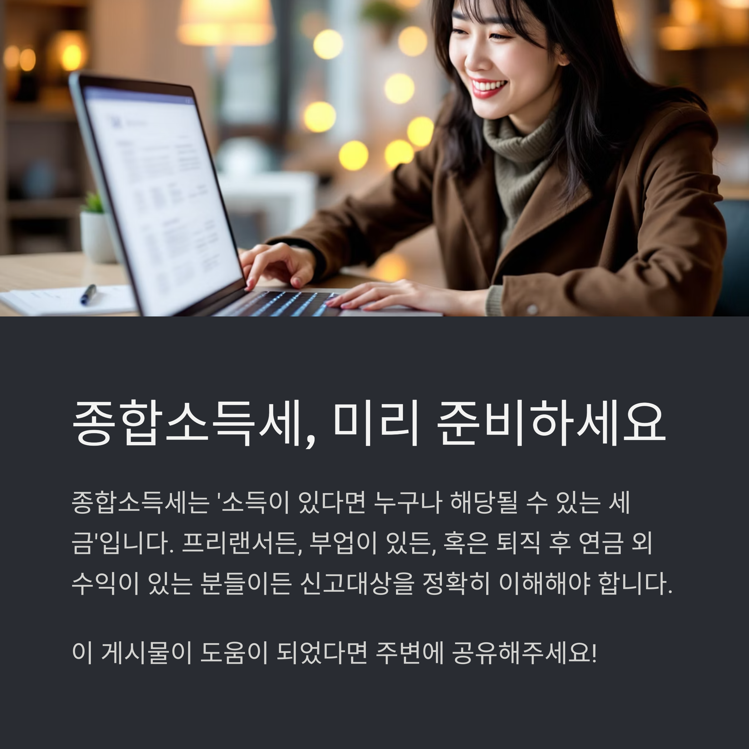 종합소득세는 ‘소득이 있다면 누구나 해당될 수 있는 세금’입니다.