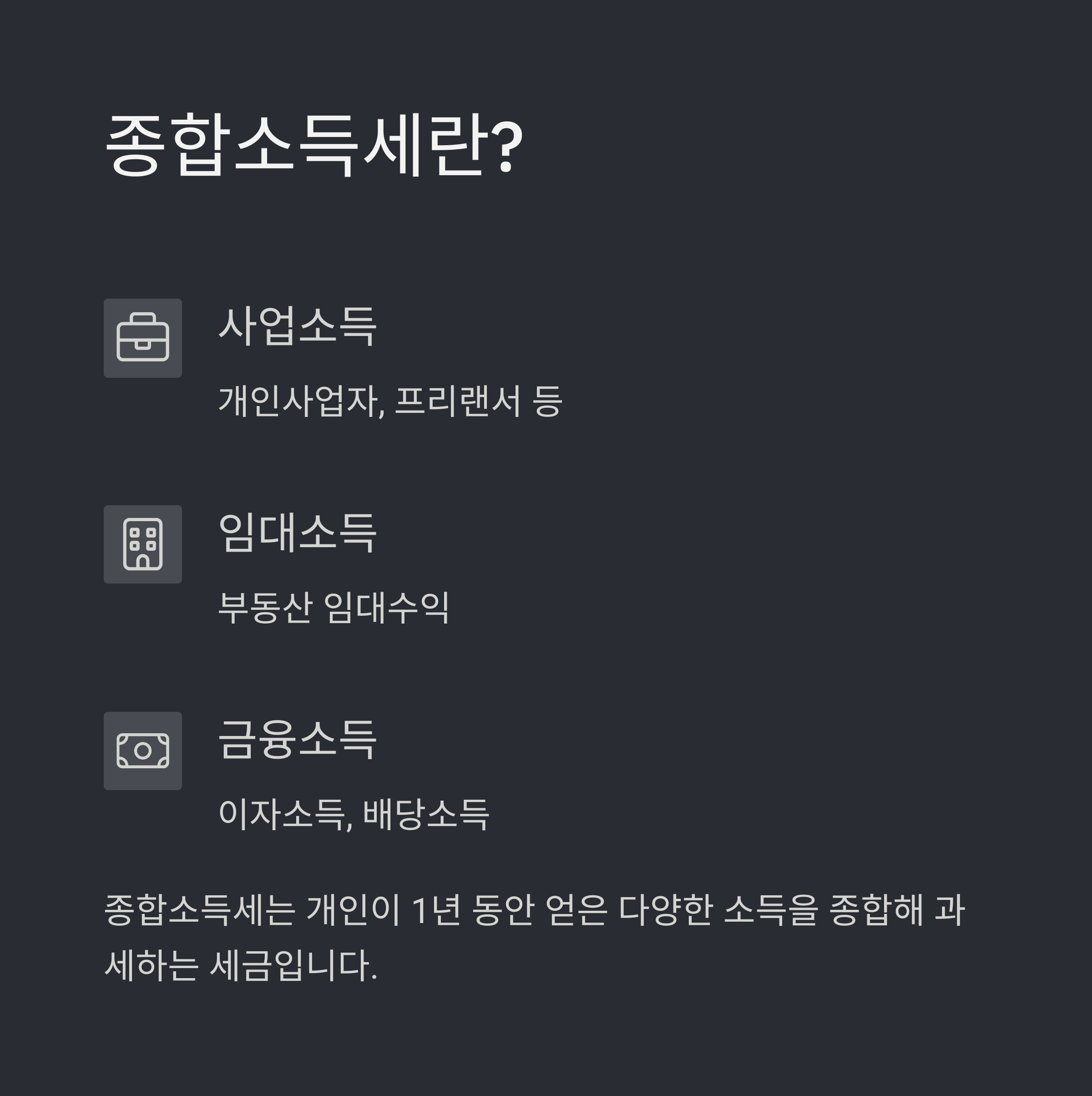 종합소득세는 개인이 1년 동안 얻은 다양한 소득을 종합해 과세하는 세금입니다.