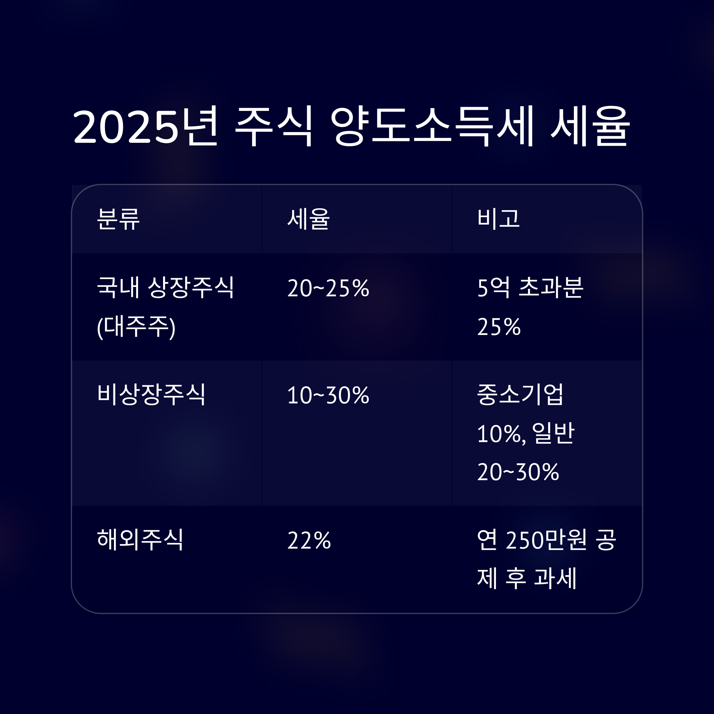 | 국내 상장주식 (대주주) | 20~25% | 5억 초과분은 25% |