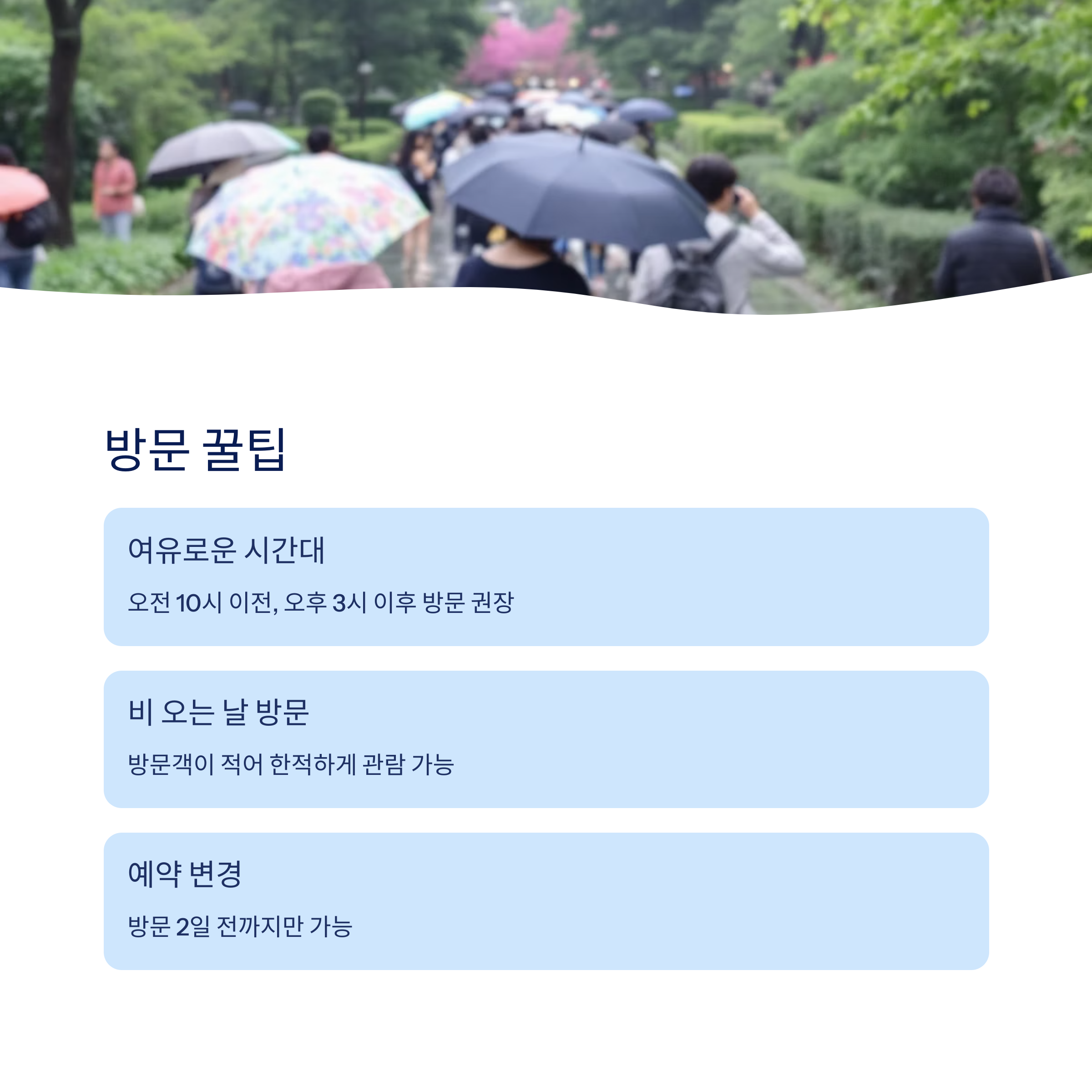 특정 시간대는 예약이 몰리기 때문에 오전 10시 이전이나 오후 3시 이후 시간대를 선택하면 상대적으로 여유롭게 관람할 수 있습니다. 또한 비오는 날은 방문객이 적어 한적하게 둘러볼 수 있어 숨겨진 꿀팁으로 꼽힙니다. 방문 전 예약 확인증을 꼭 지참하고, 예약 변경은 방문 2일 전까지만 가능하다는 점도 잊지 마세요.