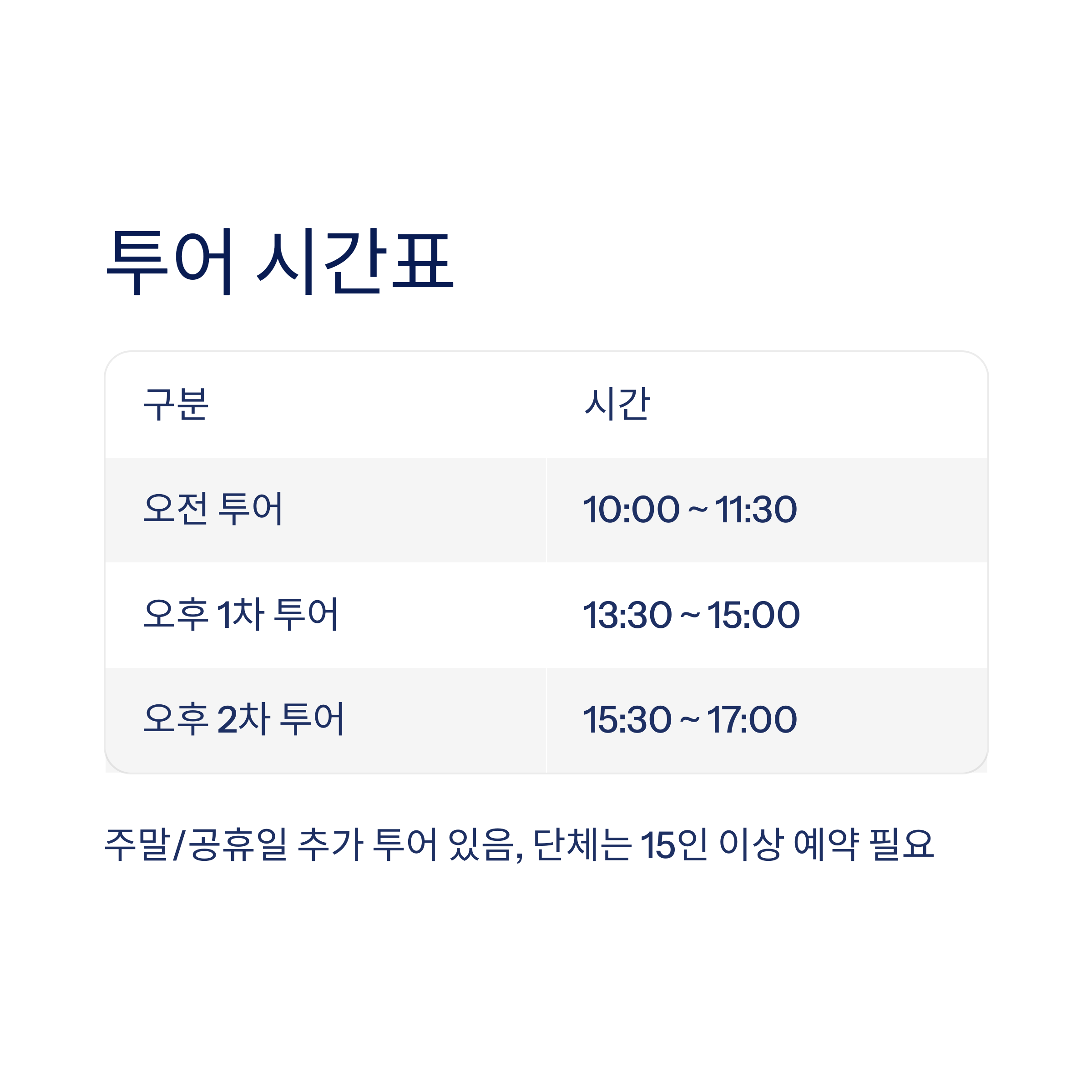 ※ 주말과 공휴일은 별도 추가 투어가 있을 수 있으므로 공식 홈페이지를 참고하세요. 단체 투어를 원하는 경우 최소 15인 이상 예약이 필요합니다.
