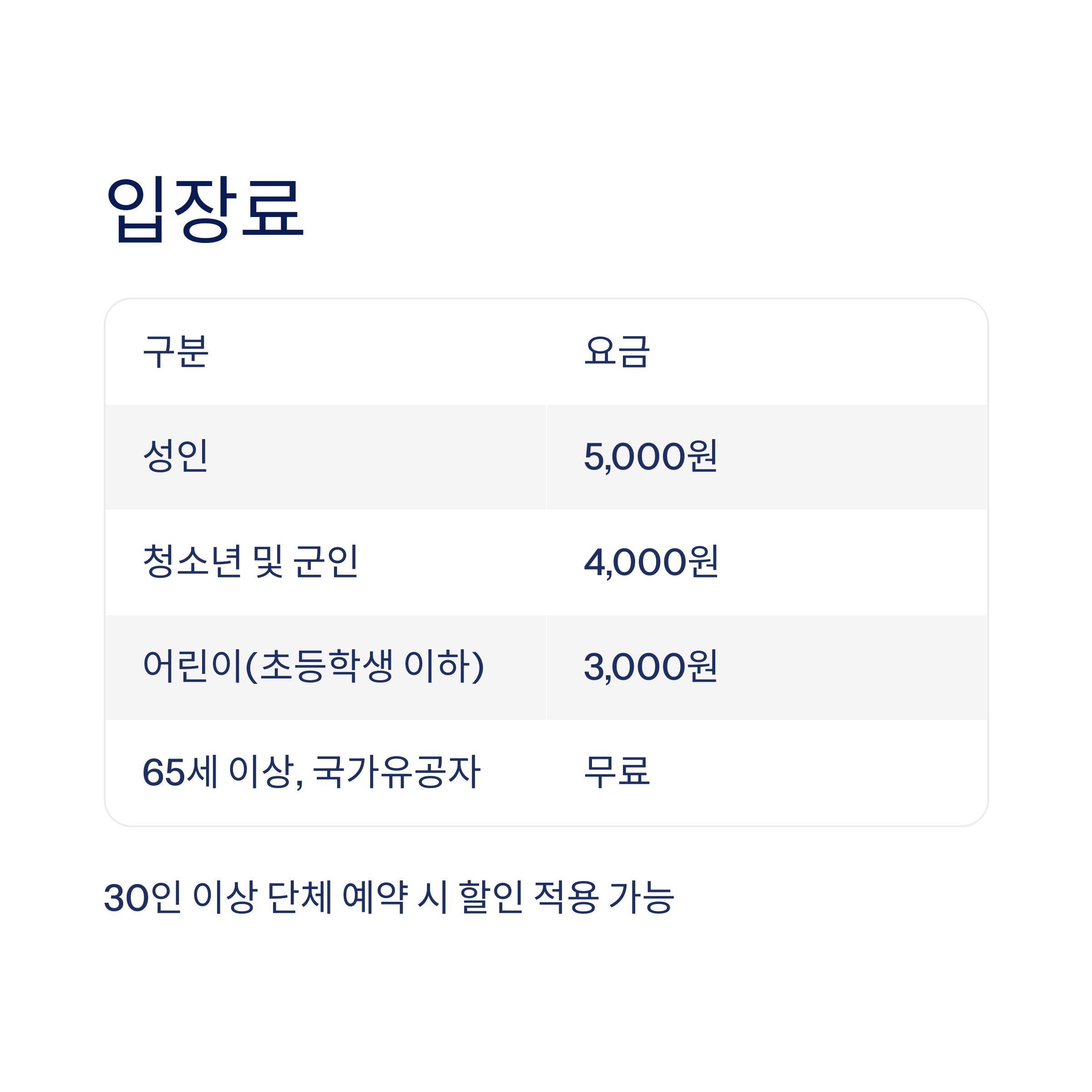 ※ 30인 이상 단체 예약 시 입장료 할인 적용 가능.