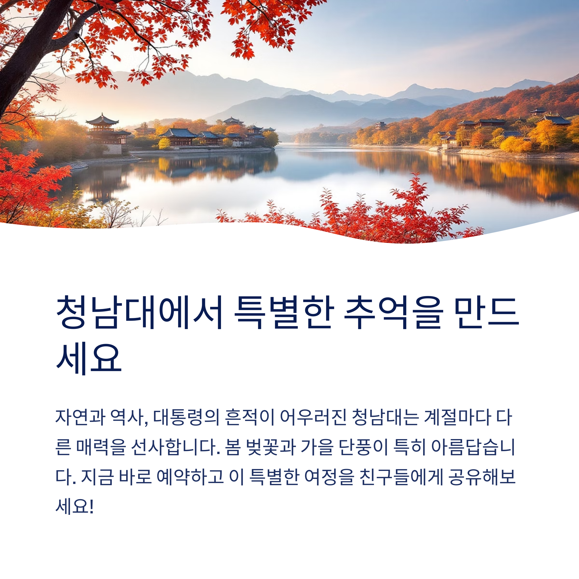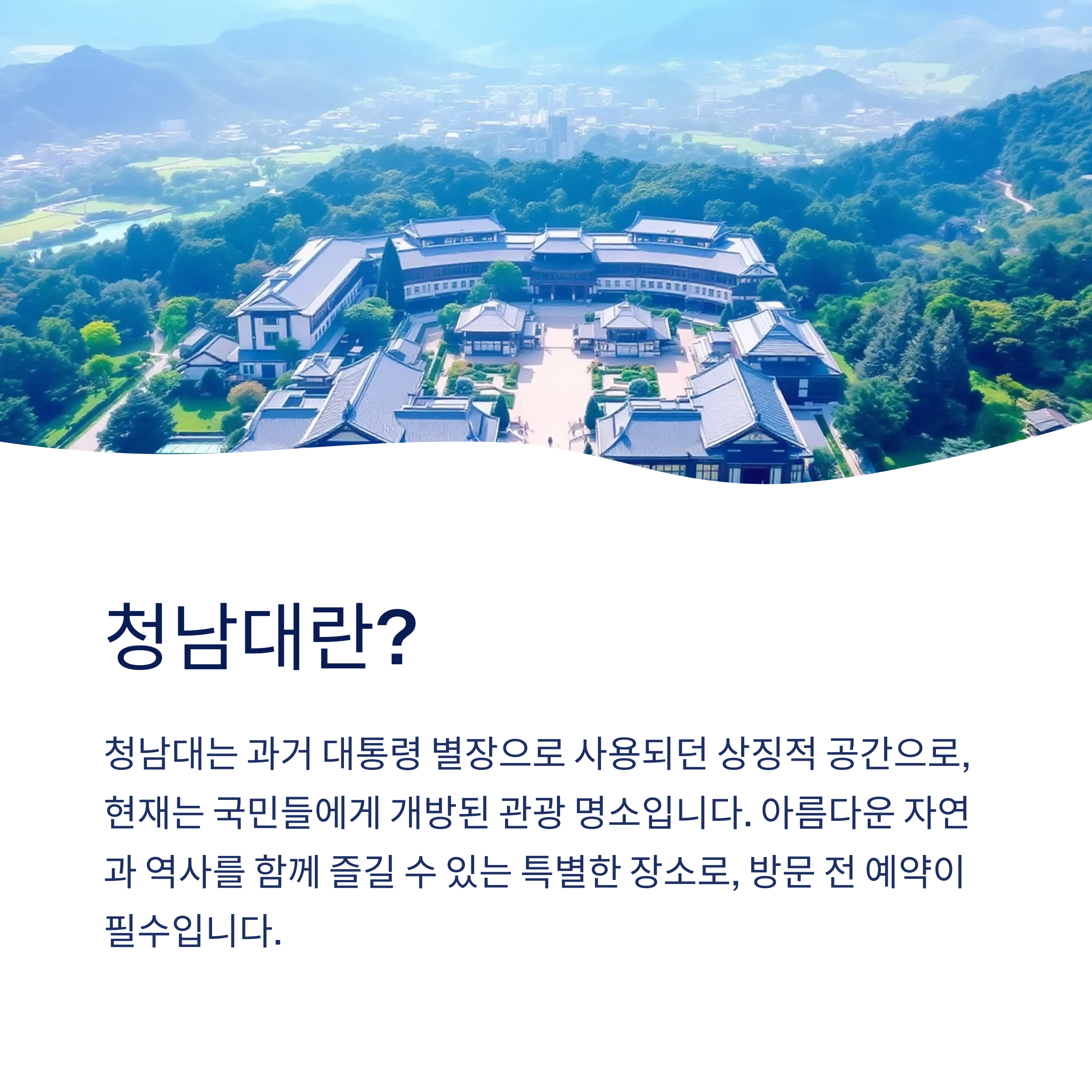 지금 바로 청남대 예약을 진행하시고, 특별한 하루를 계획해보세요. 멋진 자연과 깊은 역사 속으로 떠나는 여정이 여러분을 기다리고 있습니다!