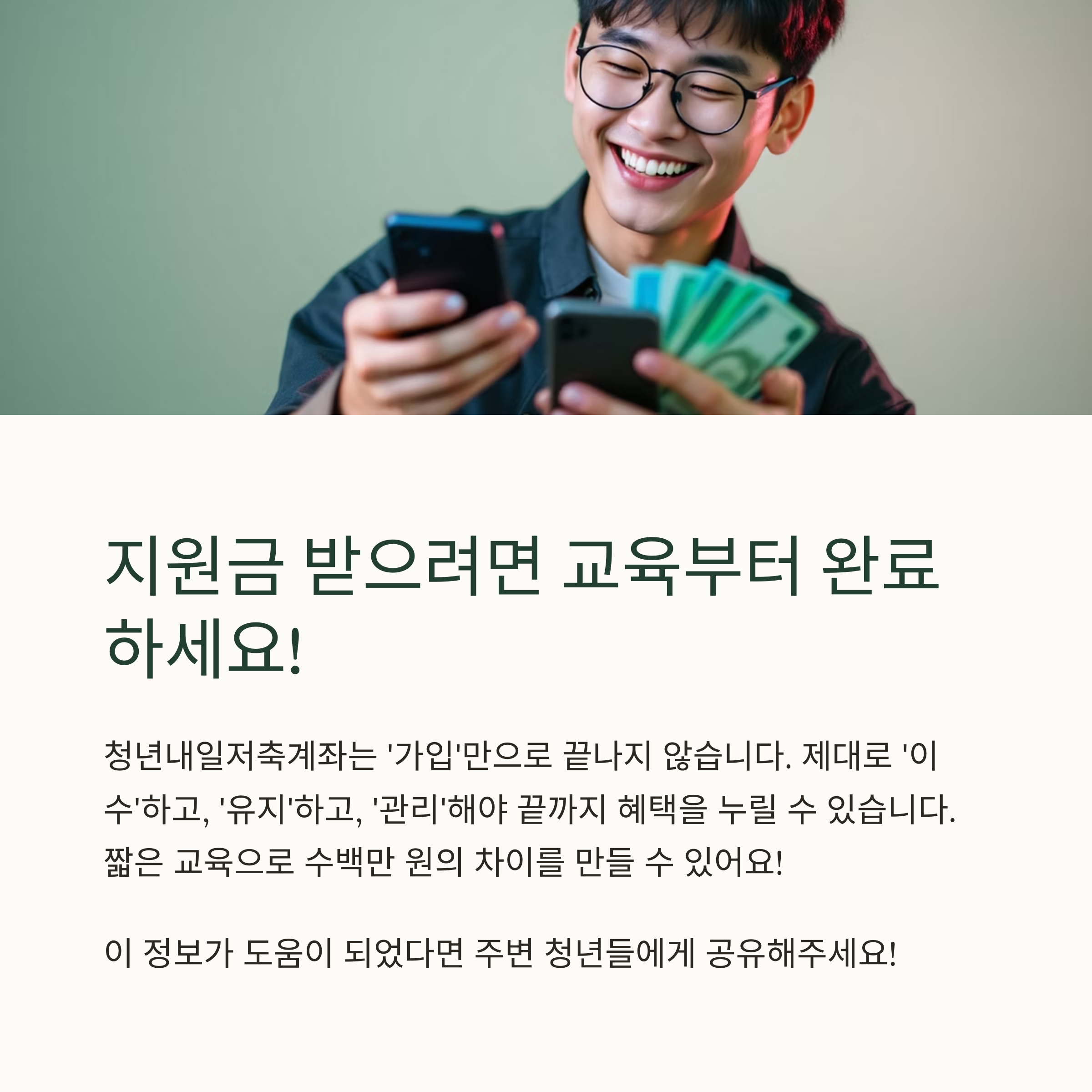 청년내일저축계좌는 ‘가입’만으로 끝나는 제도가 아닙니다. 제대로 ‘이수’하고, ‘유지’하고, ‘관리’해야 끝까지 혜택을 누릴 수 있죠.