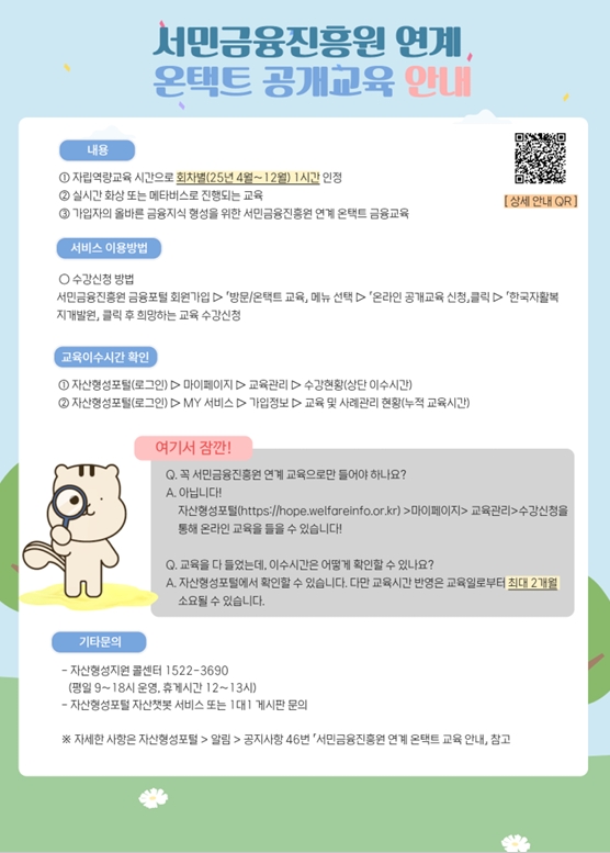 자산형성지원 교육은 온라인 교육으로 제공되며, 별도의 수강료 없이 누구나 참여 가능합니다.