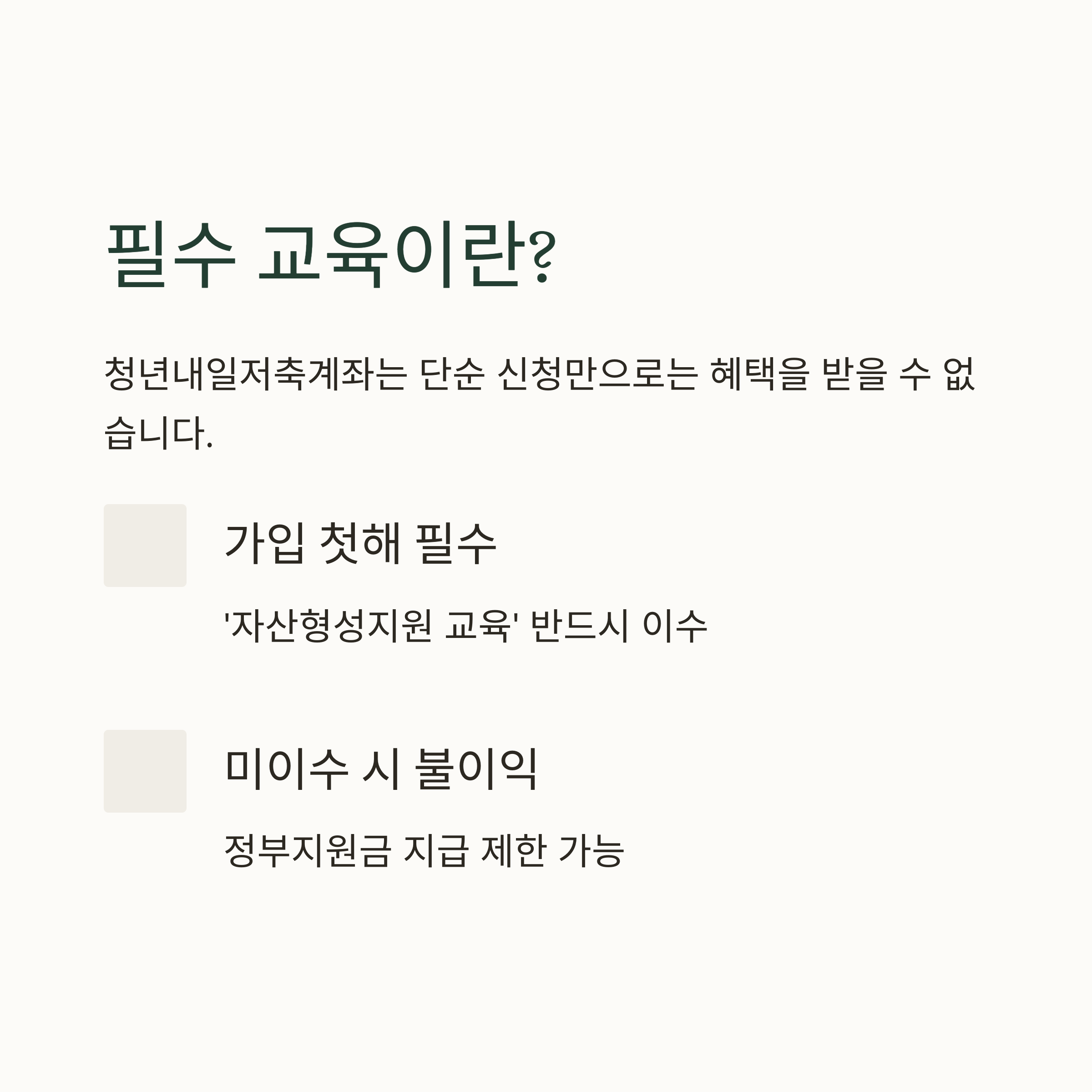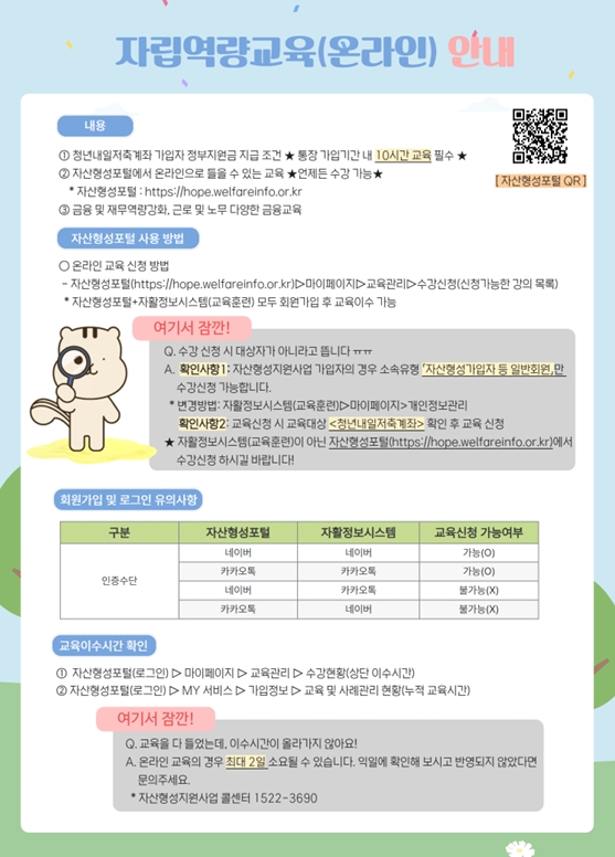 가입 첫해에 반드시 ‘자산형성지원 교육’을 이수해야 하며, 이를 이행하지 않을 경우 정부지원금 지급이 제한될 수 있습니다.
