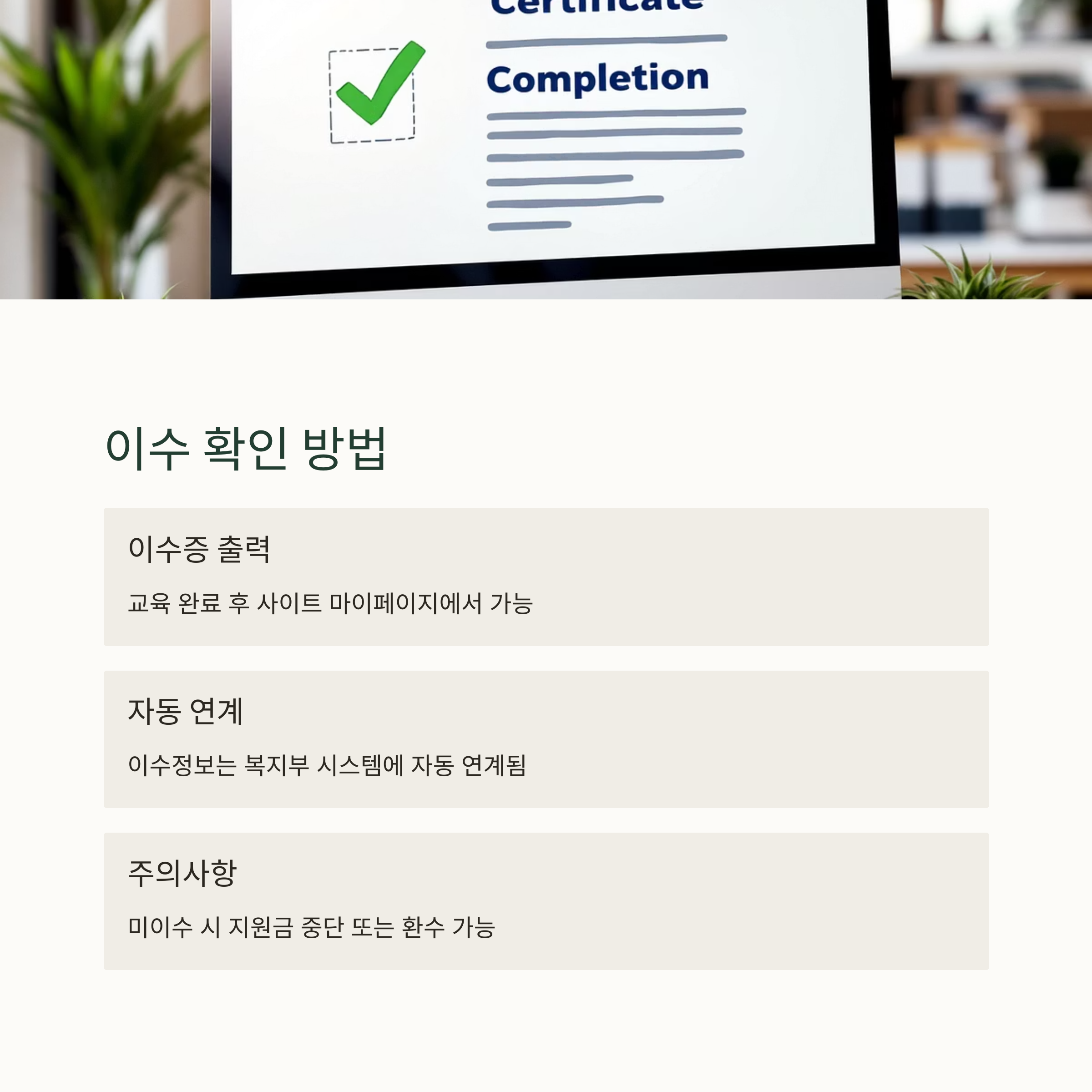 주의! 교육을 이수하지 않으면, 지원금이 중단되거나 환수될 수 있으므로 반드시 기한 내 완료하세요.