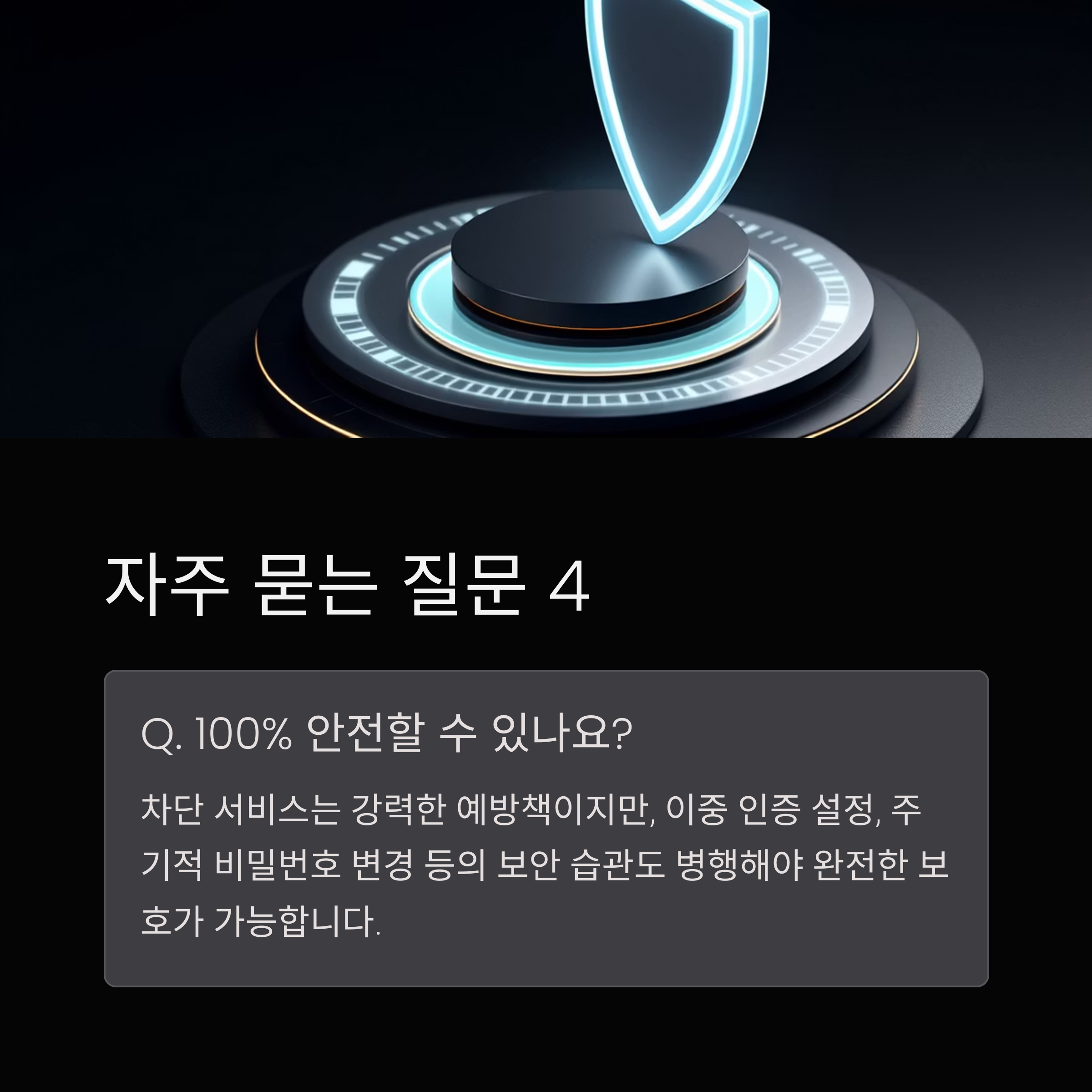 A. 차단 서비스는 매우 강력한 예방책이지만, 추가로 이중 인증 설정, 주기적 비밀번호 변경 등의 보안 습관도 병행해야 완전한 보호가 가능합니다.