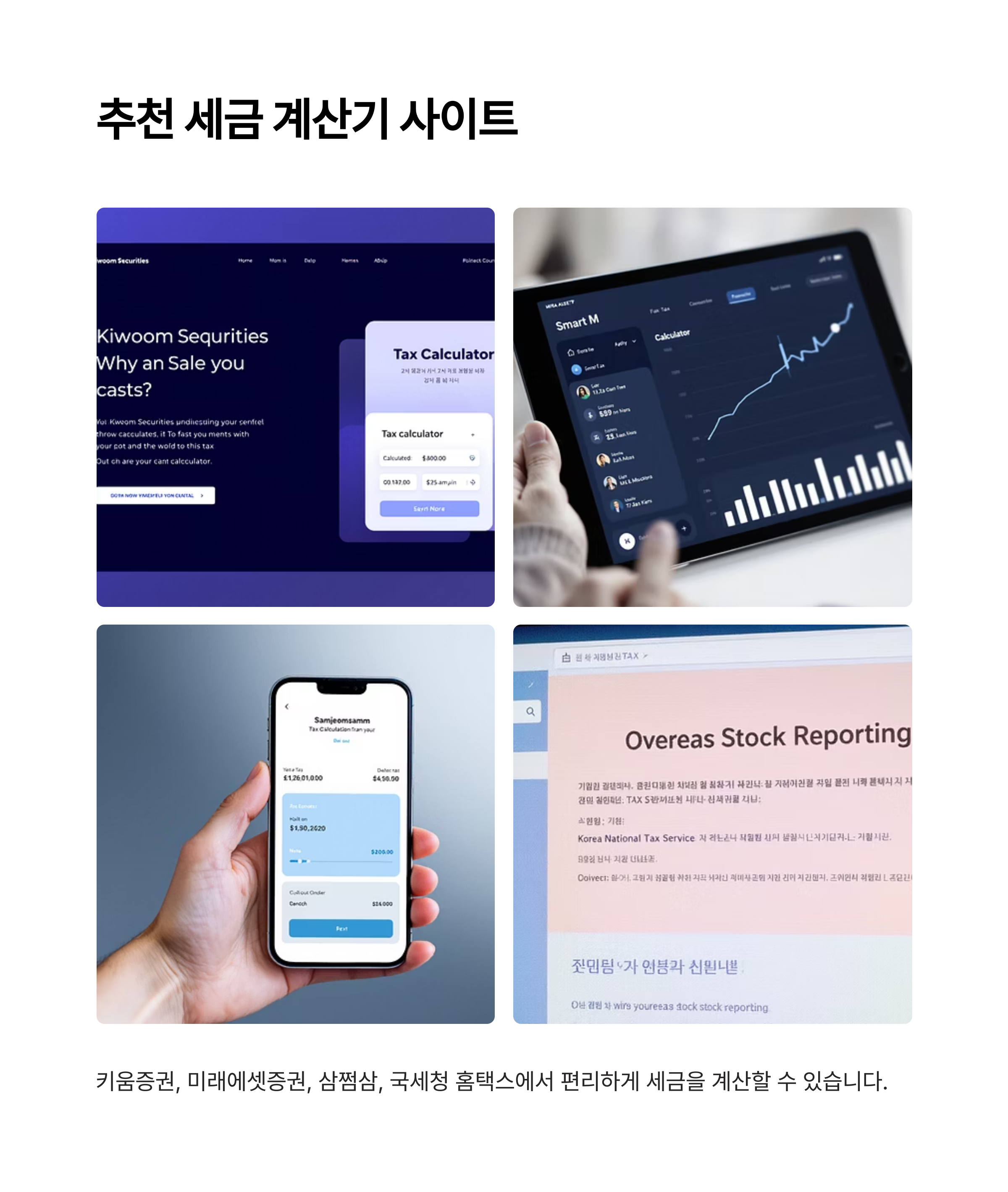 - 증권사 제공 서비스: 키움증권, 미래에셋증권, 삼성증권 등은 '양도소득세 자동계산' 기능 제공