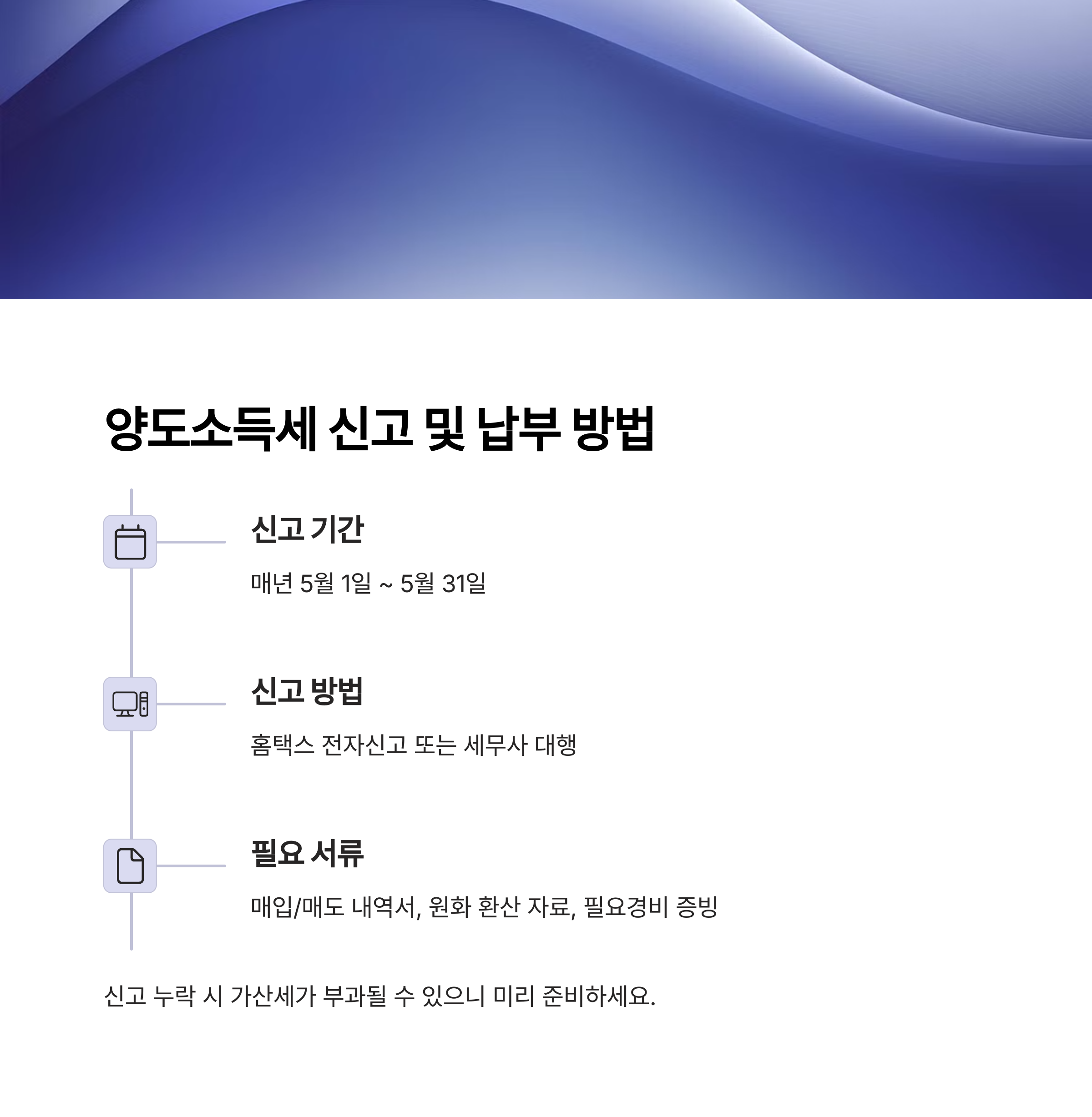 - 필요 서류: 매입/매도 내역서, 원화 환산 자료, 필요경비 증빙