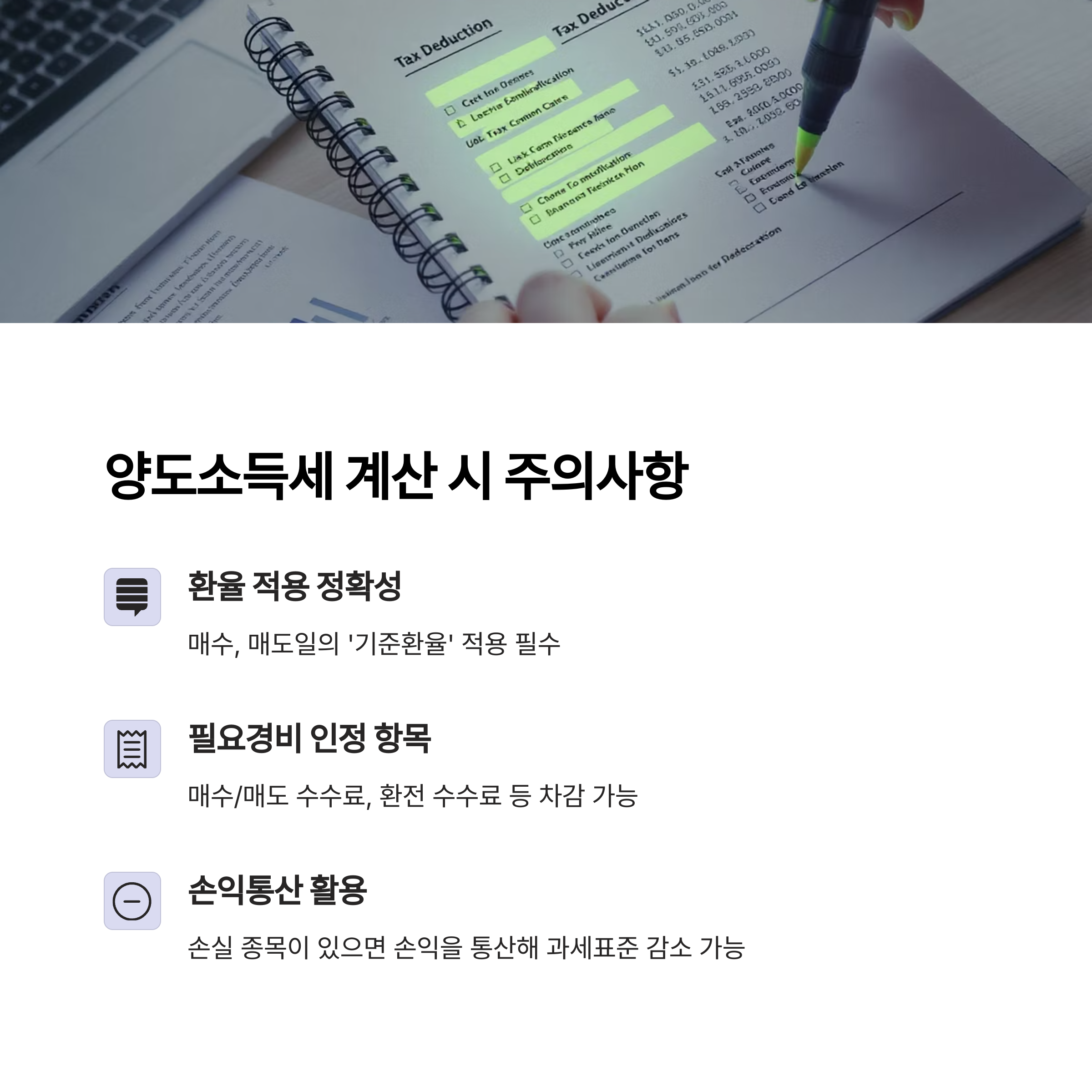 - 필요경비 인정 항목: 매수/매도 수수료, 환전 수수료, 제세공과금 등을 차감할 수 있습니다.