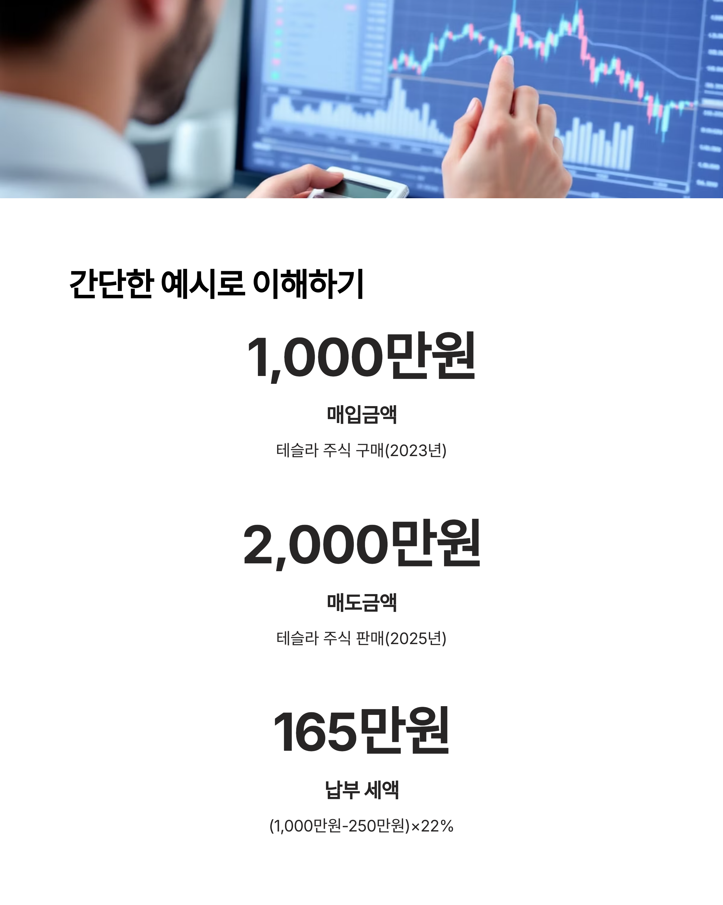 예를 들어, 테슬라 주식을 2023년 매입 당시 1,000만 원에 구매했고, 2025년에 2,000만 원에 매도했다고 가정해봅니다. 환율 적용 후 양도차익은 1,000만 원입니다.