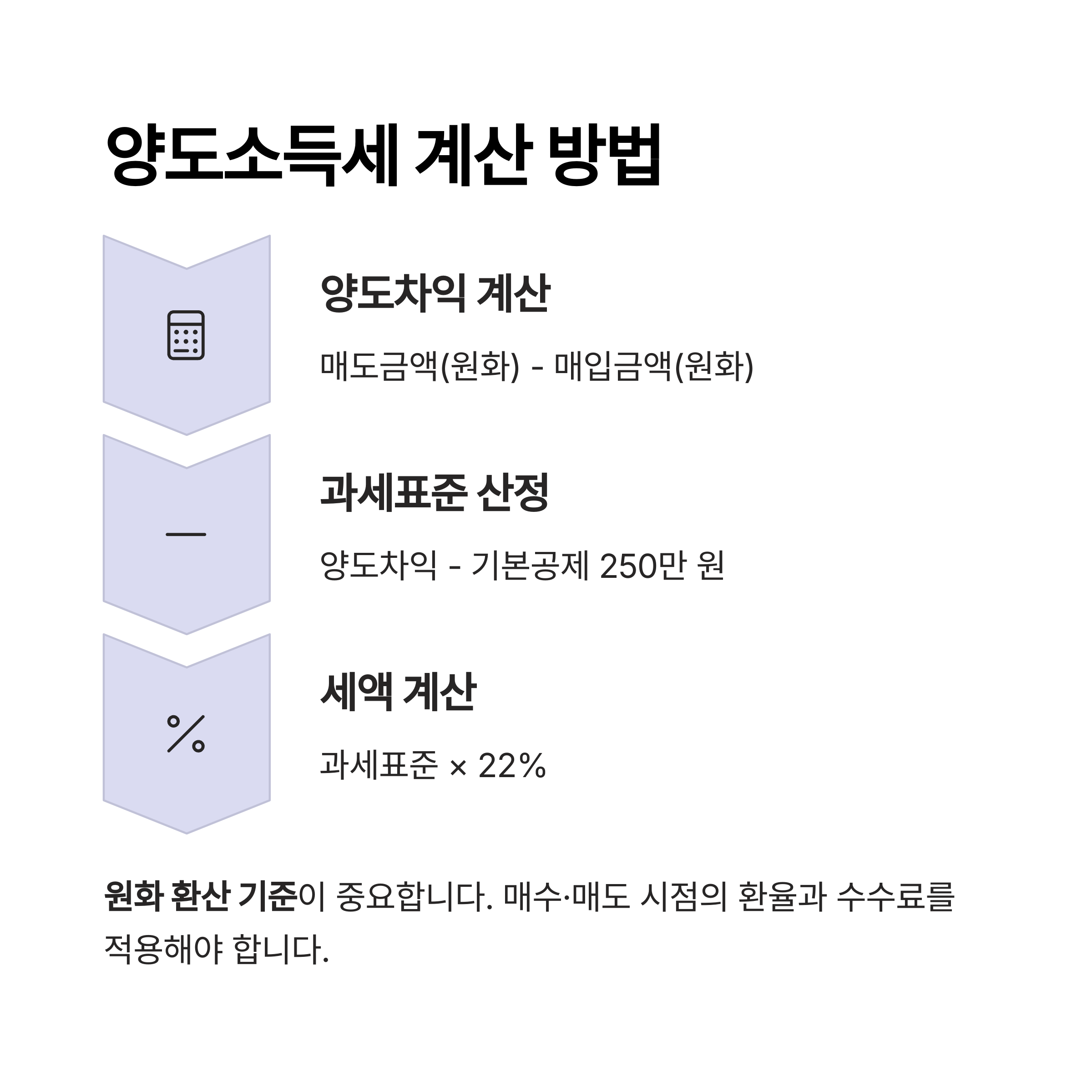 여기서 중요한 것은 원화 환산 기준입니다. 매수일과 매도일 각각의 환율을 적용해 원화 기준 금액을 산정해야 하며, 매수·매도 시점의 수수료도 필요경비로 인정받아 차감할 수 있습니다.