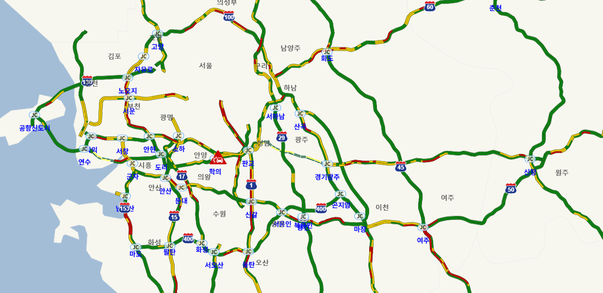 - 고속도로 구간별 정체, 사고, 통제 상황을 지도 기반으로 실시간 제공합니다.