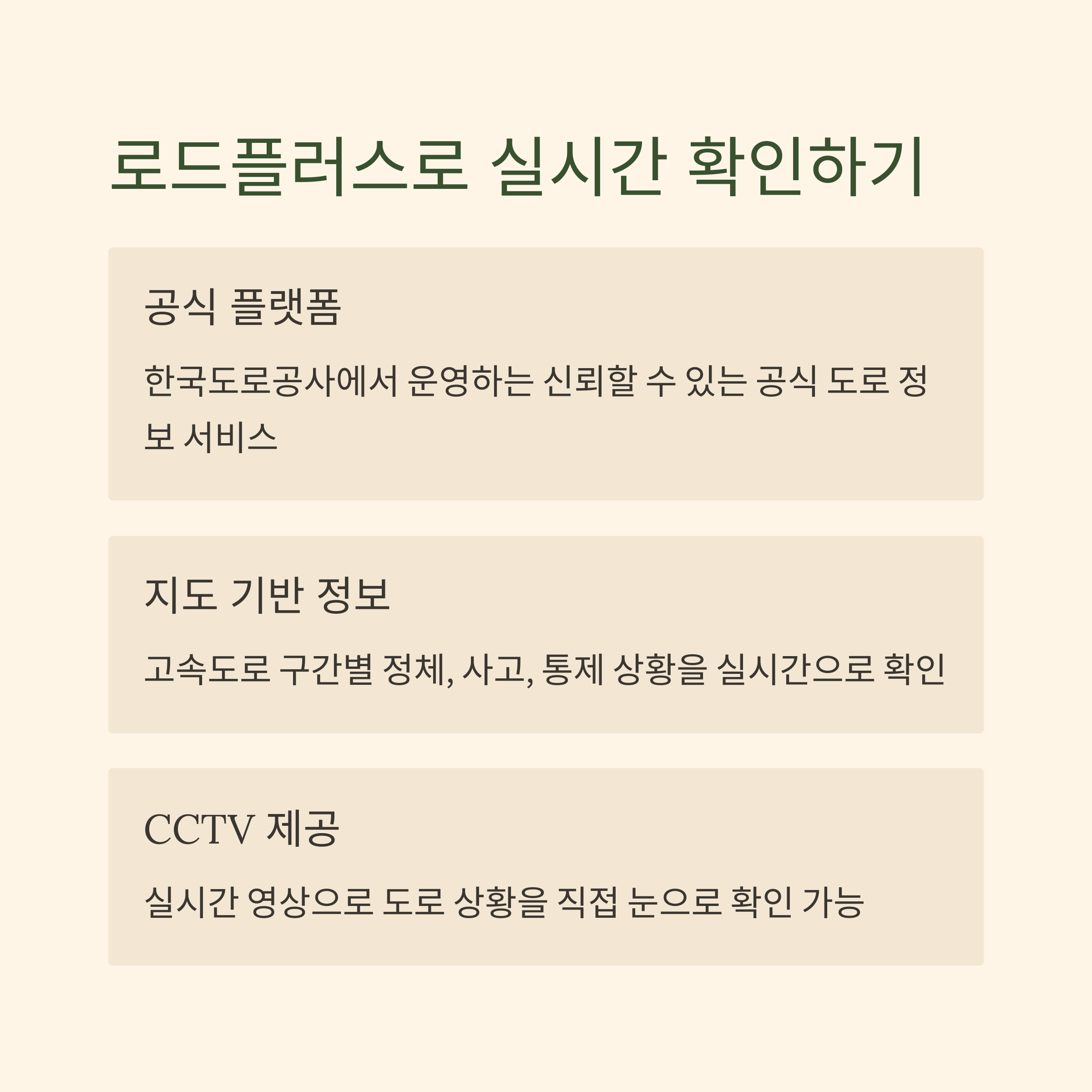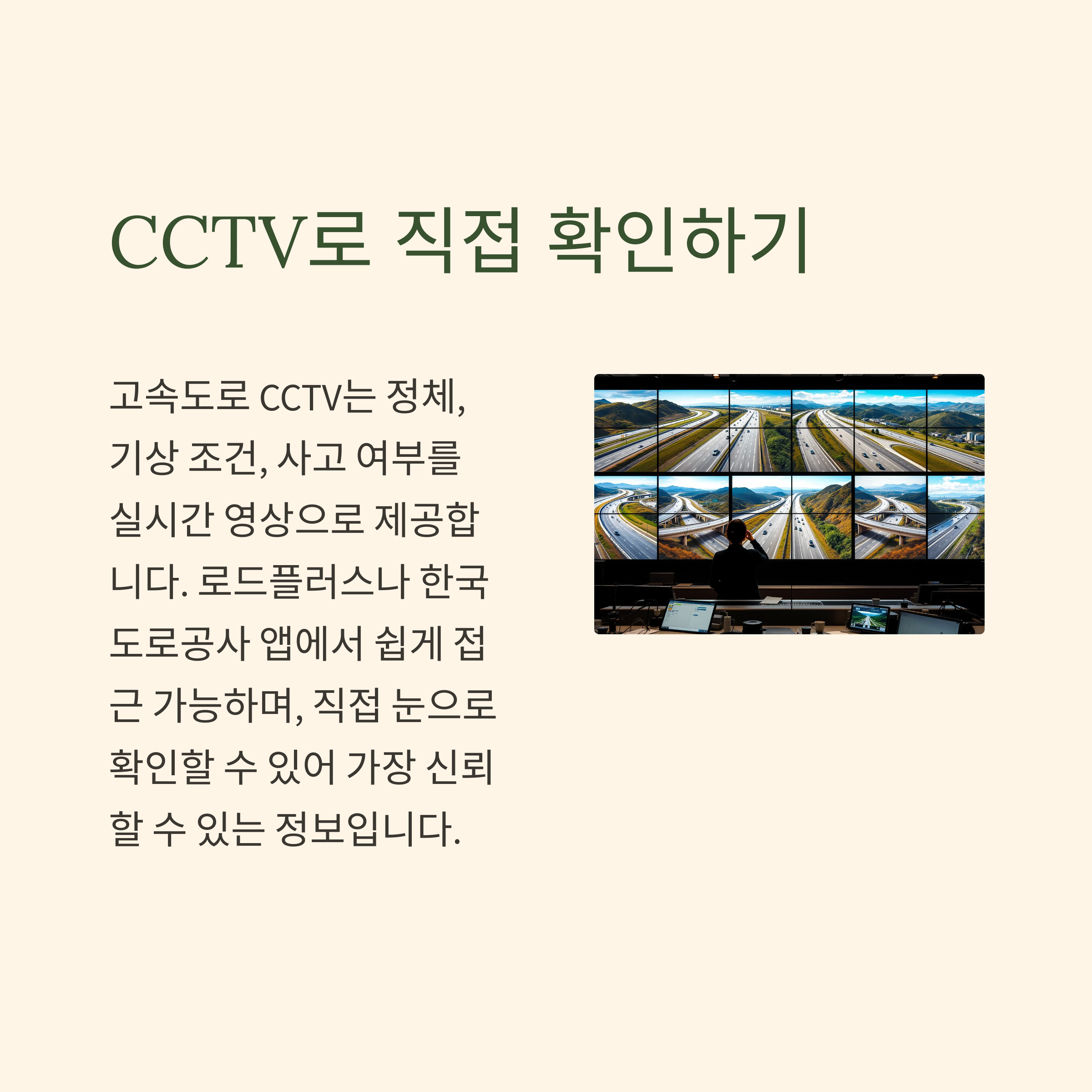 고속도로 주요 구간에 설치된 CCTV는 실시간 영상으로 정체 상황, 기상 조건, 사고 여부 등을 직접 확인할 수 있어 매우 유용합니다.