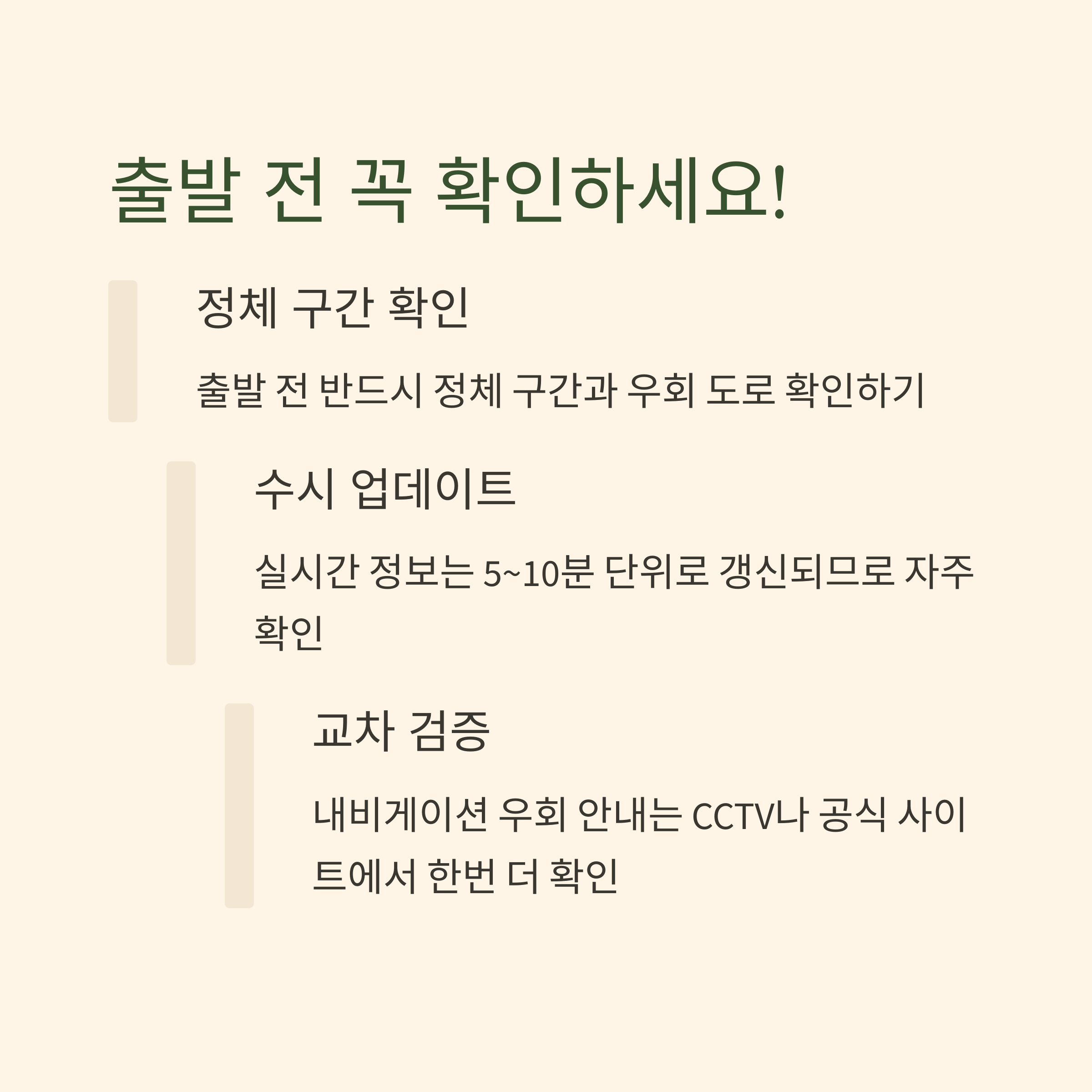- 내비게이션 앱에서 우회 안내가 나오더라도, CCTV나 공식 사이트에서 한번 더 체크하면 정확도 상승