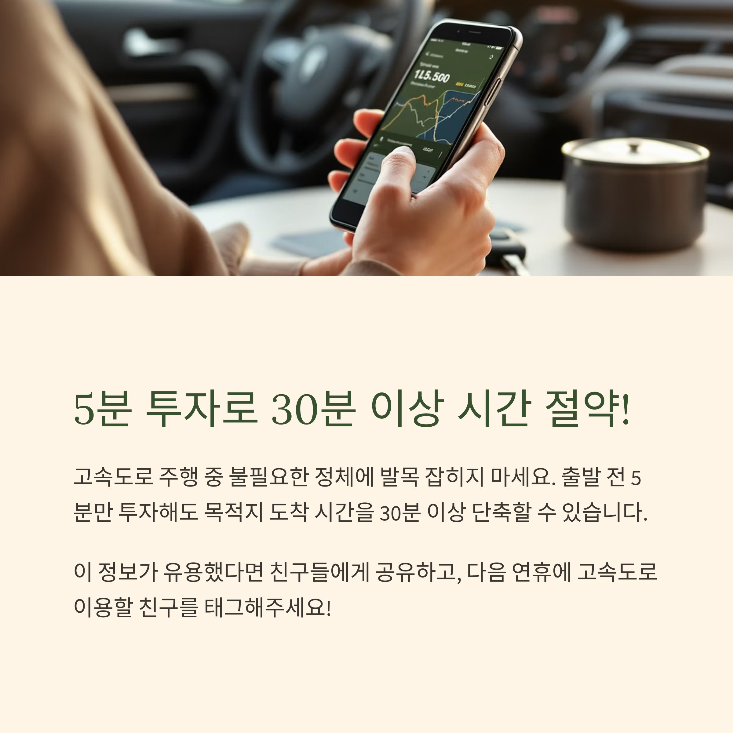 고속도로 주행 중 불필요한 정체에 발목 잡히지 않으려면, 실시간 교통상황 확인은 선택이 아닌 필수입니다. 출발 전 5분만 투자해도 목적지 도착 시간을 30분 이상 단축할 수 있습니다. 지금 바로 실시간 교통상황을 확인하고, 안전하고 빠른 이동을 계획해 보세요!