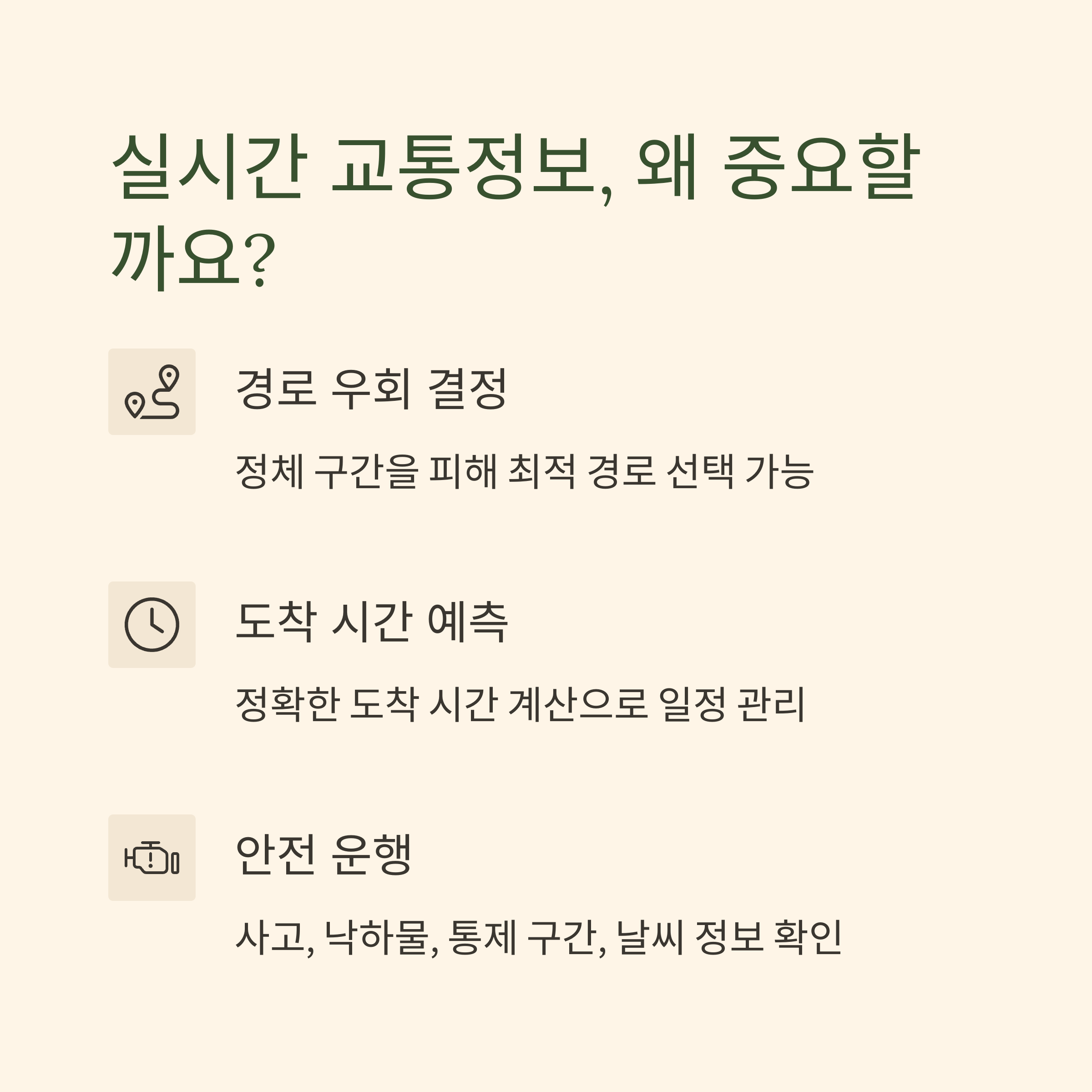 실시간 교통정보는 단순히 현재 위치의 정체 유무를 알려주는 것 이상으로, 경로 우회 결정과 도착 시간 예측에 큰 영향을 줍니다. 고속도로는 시속 100km 이상으로 주행하는 구간이 많기 때문에 갑작스러운 감속, 사고 발생 등의 위험 요소에 대한 정보도 필수적으로 확인해야 합니다.